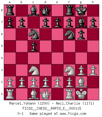 Last move : 0-1 2013 November 22 19:40:47 [Event "FICGS__CHESS__RAPID_E__000115"] [Site "FICGS"] [Date "2013.10.13"] [Round "1"] [White "Marcel,Yohann"] [Black "Neil,Charlie"] [Result "0-1"] [WhiteElo "1200"] [BlackElo "1171"] 1.Nf3 c5 2.g3 Nf6 3.Bg2 Nc6 4.O-O g6 5.h3 Bg7 6.Nc3 O-O 0-1 This chess game has been lost on time (started : 2013.10.13 12:45:21) Reti Opening Kingside Castling by player White (move 4) Kingside Castling by player Black (move 6) Player Black won this chess game. Follow this game move after move (download)Chess is a part of culture and if a culture is declining then Chess too will decline. (Mikhail Botvinnik) Jeder Fehler erscheint unglaublich dumm, wenn andre ihn begehen. (Georg Christoph Lichtenberg) Ser exitoso en el Ajedrez te permite descubrir tu propia personalidad. Eso es lo que deseo para los niños de mi clase. (Saudin Robovic) L'attaque fait le spectacle, la défense gagne les matchs. (Dicton footballistique) Luck never gives; it only lends. (Swedish proverb)