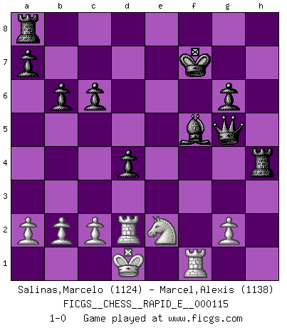 Last move : 1-0 2014 January 17 23:16:10 [Event "FICGS__CHESS__RAPID_E__000115"] [Site "FICGS"] [Date "2013.10.13"] [Round "1"] [White "Salinas,Marcelo"] [Black "Marcel,Alexis"] [Result "1-0"] [WhiteElo "1124"] [BlackElo "1138"] 1.d4 f5 2.Bf4 Nf6 3.Qd3 g6 4.Qc3 d6 5.Nh3 Nd5 6.Qb3 Nxf4 7.Nxf4 b6 8.Qd5 c6 9.Qf3 Bb7 10.e3 Qd7 11.Qh3 Bg7 12.Be2 e5 13.dxe5 Bxe5 14.Nxg6 hxg6 15.Qg3 Bxg3 16.fxg3 Ba6 17.Bf3 d5 18.Nc3 Qe6 19.O-O-O Qxe3+ 20.Rd2 Kf7 21.g4 fxg4 22.Bxg4 Bc8 23.Bf3 Nd7 24.Kd1 Ne5 25.Re1 Qg5 26.h4 Rxh4 27.Rf1 Nxf3 28.Rxf3+ Bf5 29.Rf1 d4 30.Ne2 1-0 This chess game has been lost on time (started : 2013.10.13 12:45:21) Dutch Queenside Castling by player White (move 19) Player White won this chess game. Follow this game move after move (download)Let the perfectionist play postal. (Yasser Seirawan) Man wirke der falschen Auffassung entgegen, als ob jeder Zug Unmittelbares zu leisten habe; auch Werte- und Ruhezüge haben ihre Existenzberechtigung. (Aaron Nimzowitsch) Todos los jugadores de Ajedrez deberían tener un pasatiempo. (Savielly Tartakower) On est toujours la mazette de quelqu'un d'autre. (Anonyme) The only thing that overcomes hard luck is hard work. (Harry Golden)