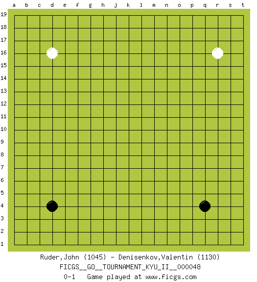 Last move : 0-1 2013 November 18 7:7:38 [Event "FICGS__GO__TOURNAMENT_KYU_II__000048"] [Site "FICGS"] [Date "2013.10.15"] [Round "1"] [Black "Ruder,John"] [White "Denisenkov,Valentin"] [Result "0-1"] [Rating 1 "1045"] [Rating 2 "1130"] 1.q4 d16 2.d4 r16 0-1 This go game has been lost on time (started : 2013.10.15 2:58:6) Here are the names of the openings (joseki) played in the four corners : Player White won this Go (weiqi, baduk) game. Follow this game move after move (download)In the sound of the stone you can hear its purpose. (Pierre Audouard) I have opinions of my own - strong opinions - but I don't always agree with them. (George Bush)
