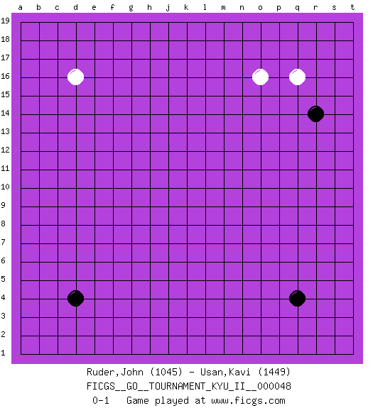 Last move : 0-1 2013 November 20 7:20:59 [Event "FICGS__GO__TOURNAMENT_KYU_II__000048"] [Site "FICGS"] [Date "2013.10.15"] [Round "1"] [Black "Ruder,John"] [White "Usan,Kavi"] [Result "0-1"] [Rating 1 "1045"] [Rating 2 "1449"] 1.q4 d16 2.d4 q16 3.r14 o16 0-1 This go game has been lost on time (started : 2013.10.15 2:58:6) Here are the names of the openings (joseki) played in the four corners : Corner q16 : q16 r14 Hoshi (Hwajeom, Seongjeom, Xingwei`) 4-4 Point. The star or hoshi (4-4) point, emphasizing influence at the potential expense of territory. Ikken Kakari (Hankan Keolch'im, Yi Gua`jiao~, 1-Space Low Approach). Black 2 is the standard approach move to the 4-4. Player White won this Go (weiqi, baduk) game. Follow this game move after move (download)A meijin needs no joseki. (Anonymous) Life is like a play: it's not the length but the excellence of the acting that matters. (Seneca)