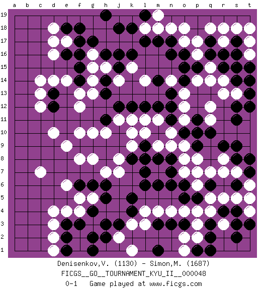 Last move : 0-1 2014 January 20 9:16:21 [Event "FICGS__GO__TOURNAMENT_KYU_II__000048"] [Site "FICGS"] [Date "2013.10.15"] [Round "1"] [Black "Denisenkov,Valentin"] [White "Simon,Mickael"] [Result "0-1"] [Rating 1 "1130"] [Rating 2 "1687"] 1.q16 d4 2.q3 d16 3.r9 n4 4.f17 c14 5.k16 d10 6.h3 k3 7.e3 d3 8.h5 q5 9.r4 r5 10.o3 o4 11.n3 m4 12.m3 l4 13.k4 l3 14.k5 q11 15.p9 r14 16.r15 q14 17.s11 o17 18.o16 p17 19.s14 s13 20.s15 r17 21.o14 p14 22.o15 o13 23.n13 o12 24.q17 q18 25.s17 s18 26.r16 r18 27.n17 p16 28.p15 q15 29.t13 r13 30.s12 t14 31.t15 t17 32.s16 t18 33.t12 t16 34.t14 n18 35.n12 o11 36.s6 s5 37.s4 t4 38.t3 t5 39.s2 q4 40.m10 m11 41.n11 n10 42.o10 n9 43.p11 q12 44.q10 l11 45.l9 o7 46.m17 m18 47.l17 e4 48.f3 c7 49.d12 c12 50.d13 c13 51.f14 f10 52.j10 f12 53.h13 j11 54.h11 h10 55.j12 k10 56.j9 k9 57.k12 k11 58.k8 m9 59.l8 l10 60.l12 n14 61.n16 j8 62.h9 g10 63.h8 j7 64.l6 h7 65.f9 f8 66.g9 e9 67.m12 g8 68.j3 j19 69.k18 k19 70.l19 l18 71.j18 m19 72.h19 e17 73.f16 r3 74.s3 p3 75.q2 p2 76.p1 o2 77.m1 o1 78.q1 j2 79.h2 k1 80.f6 s7 81.s8 r7 82.t7 t6 83.t8 r8 84.s9 o18 85.l19 d14 86.e18 d18 87.e16 d17 88.p5 p6 89.q6 q7 90.o6 p7 91.n6 m7 92.m6 f4 93.g4 e14 94.o5 p4 95.l7 f13 96.m8 g14 97.f15 g13 98.j15 g15 99.h16 g16 100.g17 j14 101.h14 h15 102.f18 k15 103.j16 l14 104.m14 f2 105.e2 d2 106.g2 f1 107.e1 d1 108.g1 g5 109.g6 f5 110.h6 e6 111.n7 o9 112.p10 p8 113.n8 o8 0-1 Here are the names of the openings (joseki) played in the four corners : Corner d16 : d16 f17 Hoshi (Hwajeom, Seongjeom, Xingwei`) 4-4 Point. The star or hoshi (4-4) point, emphasizing influence at the potential expense of territory. Ikken Kakari (Hankan Keolch'im, Yi Gua`jiao~, 1-Space Low Approach). Black 2 is the standard approach move to the 4-4. Corner d4 : d4 h3 Hoshi (Hwajeom, Seongjeom, Xingwei`) 4-4 Point. The star or hoshi (4-4) point, emphasizing influence at the potential expense of territory. Corner q16 : q16 q11 Hoshi (Hwajeom, Seongjeom, Xingwei`) 4-4 Point. The star or hoshi (4-4) point, emphasizing influence at the potential expense of territory. Player White won this Go (weiqi, baduk) game. Follow this game move after move (download)The second line is the line of defeat, the third line is the line of territory, and the fourth line is the line of influence. (Anonymous) The ego is not master in its own house. (Sigmund Freud)