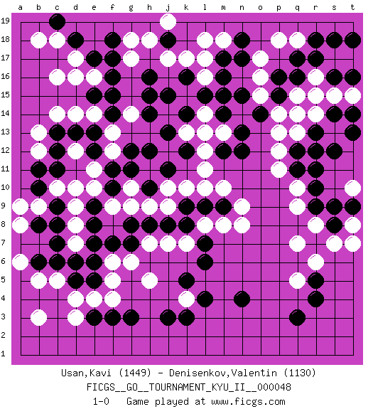 Last move : 1-0 2014 January 13 18:58:42 [Event "FICGS__GO__TOURNAMENT_KYU_II__000048"] [Site "FICGS"] [Date "2013.10.15"] [Round "1"] [Black "Usan,Kavi"] [White "Denisenkov,Valentin"] [Result "1-0"] [Rating 1 "1449"] [Rating 2 "1130"] 1.q16 d3 2.q3 d17 3.r9 o17 4.q14 q18 5.r17 l16 6.d5 d8 7.e3 d4 8.e5 e4 9.f3 f4 10.g3 f5 11.e7 d7 12.d6 f6 13.e6 b5 14.b6 c5 15.c6 c10 16.f7 b3 17.c12 f9 18.g7 h9 19.e9 e10 20.e8 d9 21.f10 g10 22.f11 e11 23.g11 h11 24.e12 f12 25.g12 f13 26.h12 d12 27.e13 e14 28.d13 d14 29.c13 c14 30.c11 d10 31.b10 b9 32.b11 b13 33.b8 a9 34.c7 b12 35.c9 q5 36.r5 r6 37.r4 q7 38.n4 q9 39.r10 q10 40.q11 p11 41.q12 p12 42.j11 k4 43.j3 h5 44.k3 j7 45.h10 g9 46.h8 j9 47.j8 j10 48.k8 l10 49.l6 k7 50.l7 l8 51.l9 m8 52.k9 k10 53.m9 n8 54.k12 l12 55.l13 m10 56.j15 j14 57.h14 g14 58.h15 n9 59.l4 h7 60.g8 g6 61.f15 a6 62.c8 a8 63.f14 g17 64.f17 e16 65.f16 j17 66.m12 l14 67.k14 k15 68.j13 m13 69.m14 k13 70.k16 k17 71.l15 l13 72.m16 l17 73.m17 m18 74.n18 l18 75.n17 n14 76.m15 o15 77.n13 l11 78.o14 p14 79.n15 p13 80.p15 o16 81.n12 q13 82.r13 r12 83.r11 r14 84.s12 q15 85.p16 r16 86.s16 r15 87.q17 s17 88.s18 t17 89.r18 p18 90.t18 s13 91.r12 s15 92.t16 r8 93.t13 q14 94.s14 t15 95.s8 s7 96.s9 t10 97.t14 t8 98.t9 t7 99.f18 g18 100.j18 h18 101.h16 j19 102.e15 c16 103.d18 c18 104.e17 d16 105.c19 b18 106.k5 1-0 Here are the names of the openings (joseki) played in the four corners : Corner q16 : q16 o17 Hoshi (Hwajeom, Seongjeom, Xingwei`) 4-4 Point. The star or hoshi (4-4) point, emphasizing influence at the potential expense of territory. Ikken Kakari (Hankan Keolch'im, Yi Gua`jiao~, 1-Space Low Approach). White 2 is the standard approach move to the 4-4. Corner d4 : d3 d5 Komoku (Somok, Xiao~mu`) 3-4 Point. The komoku (3-4) point is the traditional corner enclosure move.. Ikken Takagakari (Hankan Nop'dakeolch'im, Yi Gaogua`jiao~, 1-Space High Approach). The 5-4 approach move has become more popular in modern times, as modern Go emphasizes speed and influence. Corner d16 : d17 c12 Komoku (Somok, Xiao~mu`) 3-4 Point. The komoku (3-4) point is the traditional corner enclosure move.. Player Black won this Go (weiqi, baduk) game. Follow this game move after move (download)Pon-nuki is worth thirty points. (Anonymous) Wipe them out. All of them. (Darth Sidious in Star Wars ep.1)