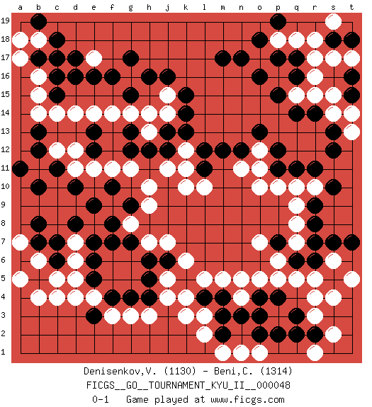 Last move : 0-1 2014 January 11 9:18:14 [Event "FICGS__GO__TOURNAMENT_KYU_II__000048"] [Site "FICGS"] [Date "2013.10.15"] [Round "1"] [Black "Denisenkov,Valentin"] [White "Beni,Clement"] [Result "0-1"] [Rating 1 "1130"] [Rating 2 "1314"] 1.q16 d4 2.q3 q5 3.o4 r3 4.r2 r4 5.r7 s2 6.p2 o5 7.s5 s4 8.r11 r1 9.q2 k3 10.l4 l3 11.m3 g3 12.d16 o17 13.r14 q18 14.m17 r17 15.o16 c4 16.d10 c14 17.c15 d14 18.f16 f14 19.c7 c12 20.e12 d12 21.e13 e14 22.b10 e11 23.g12 f11 24.g13 d11 25.b5 b4 26.f7 g14 27.j16 f9 28.e9 h9 29.f8 g11 30.j13 h7 31.g9 g8 32.f10 h10 33.p17 p18 34.q17 r16 35.o18 g16 36.g17 k12 37.j12 k11 38.k13 q8 39.r8 q9 40.r9 q10 41.q11 r10 42.s10 q15 43.n17 r15 44.p15 p6 45.q14 m5 46.m4 n4 47.n3 n5 48.p4 o10 49.m12 n11 50.n12 k6 51.g7 j11 52.h6 j7 53.h4 h3 54.j6 c17 55.d17 b15 56.c16 b16 57.b17 o12 58.o13 k4 59.k5 l5 60.f4 f3 61.g4 s14 62.s13 s15 63.b13 b14 64.b12 b11 65.a11 b6 66.c6 c5 67.b7 a5 68.c11 l2 69.m2 s6 70.s7 t5 71.r6 r5 72.p11 o11 73.p12 p10 74.g15 e17 75.e16 d6 76.e5 d5 77.e7 d7 78.d8 a7 79.b8 j14 80.k14 j15 81.k15 h13 82.h12 h14 83.h16 j5 84.h5 m1 85.o3 o1 86.o2 n1 87.e3 e4 88.e6 b18 89.c18 a17 90.c17 t13 91.s12 j4 92.l11 l10 93.l12 k10 94.q6 p5 95.p7 o7 96.s18 r18 97.t16 s19 98.t15 t14 99.t18 s17 100.p19 t17 101.b19 a18 102.t7 q7 0-1 Here are the names of the openings (joseki) played in the four corners : Corner q4 : q3 q5 Komoku (Somok, Xiao~mu`) 3-4 Point. The komoku (3-4) point is the traditional corner enclosure move.. Ikken Takagakari (Hankan Nop'dakeolch'im, Yi Gaogua`jiao~, 1-Space High Approach). The 5-4 approach move has become more popular in modern times, as modern Go emphasizes speed and influence. Corner d16 : d16 c14 Hoshi (Hwajeom, Seongjeom, Xingwei`) 4-4 Point. The star or hoshi (4-4) point, emphasizing influence at the potential expense of territory. Ikken Kakari (Hankan Keolch'im, Yi Gua`jiao~, 1-Space Low Approach). White 2 is the standard approach move to the 4-4. Player White won this Go (weiqi, baduk) game. Follow this game move after move (download)If there is no stone on the handicap point, the carpenter's square is dead. (Anonymous) Thus, what is of supreme importance in war is to attack the enemy's strategy. (Sun Tzu)