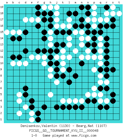 Last move : 1-0 2014 January 16 19:57:38 [Event "FICGS__GO__TOURNAMENT_KYU_II__000048"] [Site "FICGS"] [Date "2013.10.15"] [Round "1"] [Black "Denisenkov,Valentin"] [White "Bearg,Nat"] [Result "1-0"] [Rating 1 "1130"] [Rating 2 "1107"] 1.q16 d17 2.q3 c4 3.e3 k10 4.d15 q10 5.d5 c5 6.d6 d3 7.e4 e2 8.f2 e1 9.f1 c2 10.g3 k16 11.r14 d10 12.d12 k4 13.j3 r4 14.r3 q4 15.p4 p5 16.o4 o5 17.k3 l4 18.l3 m4 19.n3 n4 20.m3 h5 21.q6 q7 22.r6 r7 23.s4 q5 24.s5 p6 25.r11 q11 26.r10 q12 27.r12 p16 28.p14 o14 29.p13 o12 30.o13 n13 31.o15 n14 32.o16 p17 33.p15 o17 34.n17 n18 35.m16 l14 36.f16 f17 37.g17 e17 38.h16 c15 39.c14 b15 40.b14 a15 41.b11 b10 42.c11 c10 43.m18 q17 44.r16 r17 45.s17 s18 46.s16 t18 47.o18 p18 48.n19 p19 49.r19 s19 50.o19 r18 51.j8 h8 52.j9 h9 53.j10 j11 54.h10 g10 55.h11 g11 56.j12 k11 57.g12 f11 58.f12 e11 59.p12 p11 60.n12 o11 61.l12 k12 62.k13 l13 63.j13 m12 64.m8 l8 65.l9 k9 66.k8 l11 67.l7 j7 68.n10 n11 69.q9 r9 70.r8 q8 71.s9 p9 72.r9 q13 73.r13 q14 74.k15 l16 75.l15 j16 76.j15 l17 77.l18 j17 78.h17 j18 79.h18 m15 80.q15 h19 81.g18 g19 82.f19 j19 83.f18 h15 84.g15 h14 85.g14 h13 86.h12 n15 87.n16 1-0 Here are the names of the openings (joseki) played in the four corners : Corner d4 : c4 e3 Komoku (Somok, Xiao~mu`) 3-4 Point. The komoku (3-4) point is the traditional corner enclosure move.. Ikken Kakari (Hankan Keolch'im, Yi Gua`jiao~, 1-Space Low Pincer). The small knight move is the basic approach move to the 3-4 point stone. It has been continually used for over four centuries. There are limitless variations, with new moves constantly being discovered. Black 2 opens the door to a treaure store of joseki. Corner d16 : d17 d15 Komoku (Somok, Xiao~mu`) 3-4 Point. The komoku (3-4) point is the traditional corner enclosure move.. Ikken Takagakari (Hankan Nop'dakeolch'im, Yi Gaogua`jiao~, 1-Space High Approach). The 5-4 approach move has become more popular in modern times, as modern Go emphasizes speed and influence. Corner q4 : q3 r4 Komoku (Somok, Xiao~mu`) 3-4 Point. The komoku (3-4) point is the traditional corner enclosure move.. Player Black won this Go (weiqi, baduk) game. Follow this game move after move (download)Every move brings change. (Pierre Audouard) Knowledge will give you power, but character respect. (Bruce Lee)