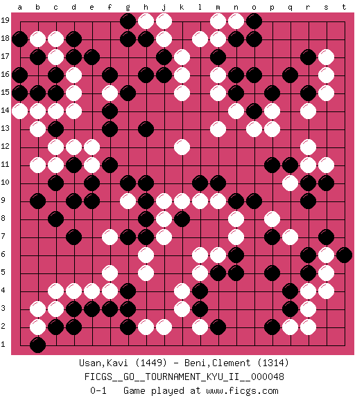Last move : 0-1 2014 April 25 8:20:54 [Event "FICGS__GO__TOURNAMENT_KYU_II__000048"] [Site "FICGS"] [Date "2013.10.15"] [Round "1"] [Black "Usan,Kavi"] [White "Beni,Clement"] [Result "0-1"] [Rating 1 "1449"] [Rating 2 "1314"] 1.q16 d4 2.q4 d16 3.l3 r14 4.q11 p14 5.o16 s16 6.r17 s11 7.r9 k17 8.h16 k15 9.j16 k16 10.f16 d14 11.d17 c17 12.e17 c18 13.d18 s17 14.m17 c11 15.f3 f4 16.e3 e4 17.d3 c3 18.c2 c4 19.g3 h5 20.e9 d10 21.d9 c9 22.d7 f7 23.e10 e11 24.f11 e12 25.c8 m15 26.n15 m16 27.n16 k12 28.h13 m13 29.b9 g9 30.g10 j9 31.h10 r3 32.q3 r4 33.r5 s5 34.r6 s6 35.s7 q2 36.p2 r2 37.p5 l5 38.m5 m6 39.n6 l6 40.n5 q10 41.r10 r11 42.p11 n8 43.o9 n7 44.n9 n14 45.c10 b11 46.d11 d12 47.k8 m9 48.h9 j8 49.h8 j7 50.m10 l9 51.l10 k9 52.h7 h6 53.g7 k3 54.l4 k4 55.t6 s4 56.s10 r12 57.j17 l2 58.m2 b2 59.d2 h2 60.b1 b3 61.g4 f5 62.g2 j2 63.o14 o13 64.p15 p13 65.c15 d15 66.c16 b16 67.b15 b14 68.b17 c14 69.a16 b18 70.a18 m18 71.n18 l18 72.r15 s15 73.c13 a14 74.a15 f15 75.f13 b13 76.g15 c12 77.f14 j18 78.h18 h19 79.g19 j19 80.g18 n19 81.o19 m19 82.o18 q7 83.p7 p8 0-1 This go game has been lost on time (started : 2013.10.15 2:58:6) Here are the names of the openings (joseki) played in the four corners : Corner q16 : q16 r14 Hoshi (Hwajeom, Seongjeom, Xingwei`) 4-4 Point. The star or hoshi (4-4) point, emphasizing influence at the potential expense of territory. Ikken Kakari (Hankan Keolch'im, Yi Gua`jiao~, 1-Space Low Approach). White 2 is the standard approach move to the 4-4. Corner d16 : d16 h16 Hoshi (Hwajeom, Seongjeom, Xingwei`) 4-4 Point. The star or hoshi (4-4) point, emphasizing influence at the potential expense of territory. Corner d4 : d4 f3 Hoshi (Hwajeom, Seongjeom, Xingwei`) 4-4 Point. The star or hoshi (4-4) point, emphasizing influence at the potential expense of territory. Ikken Kakari (Hankan Keolch'im, Yi Gua`jiao~, 1-Space Low Approach). Black 2 is the standard approach move to the 4-4. Player White won this Go (weiqi, baduk) game. Follow this game move after move (download)Go uses the most elemental materials and concepts - line and circle, wood and stone, black and white - combining them with simple rules to generate subtle strategies and complex tactics that stagger the imagination. (Iwamoto Kaoru, 9 dan professional Go player and former Honinbo title holder) It's not enough to succeed. Others must fail. (Gore Vidal)