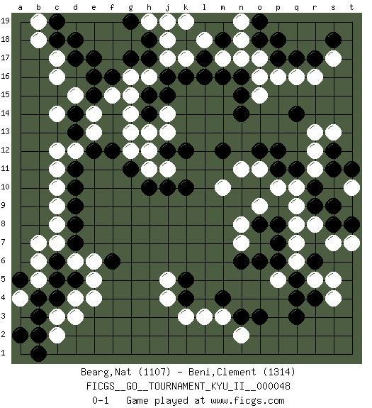 Last move : 0-1 2014 May 11 9:18:5 [Event "FICGS__GO__TOURNAMENT_KYU_II__000048"] [Site "FICGS"] [Date "2013.10.15"] [Round "1"] [Black "Bearg,Nat"] [White "Beni,Clement"] [Result "0-1"] [Rating 1 "1107"] [Rating 2 "1314"] 1.q3 r16 2.d17 o17 3.c4 e4 4.r10 c3 5.d5 d4 6.c5 e5 7.k10 d15 8.d10 c17 9.e17 c16 10.c18 b18 11.c19 b19 12.d18 k3 13.l17 o15 14.n14 c12 15.k4 j4 16.k5 l3 17.m4 q9 18.r9 p10 19.p11 o11 20.p12 o9 21.o8 n8 22.p8 q8 23.p7 q10 24.q11 m10 25.o12 n11 26.m12 r8 27.s8 s7 28.t8 n7 29.n6 q7 30.p6 r5 31.r6 q6 32.q5 s5 33.r4 t7 34.s9 p5 35.o6 s4 36.q4 f15 37.f16 g14 38.h14 g16 39.g17 c8 40.d8 c10 41.d9 c9 42.d11 d12 43.e12 c7 44.d7 d6 45.c6 e6 46.b3 d3 47.b2 r13 48.r17 q16 49.q17 s17 50.p17 p16 51.o18 n18 52.o19 n17 53.s18 l18 54.k18 k17 55.k16 n19 56.p18 j17 57.l16 j18 58.j16 g12 59.g11 h16 60.h17 m3 61.n3 c2 62.b1 b6 63.b4 b5 64.a5 b7 65.a2 a4 66.f6 j5 67.h18 k19 68.n16 o16 69.n15 r11 70.s11 r12 71.s12 s13 72.q14 c11 73.f12 n2 74.o3 t10 75.t11 h19 76.g19 j19 77.m18 m17 78.m16 h12 79.j12 h11 80.h10 j11 81.j10 j13 82.k12 j14 83.j15 g15 84.h15 h13 85.e15 e14 86.e16 g13 87.d14 c14 88.d13 e13 0-1 This go game has been lost on time (started : 2013.10.15 2:58:6) Here are the names of the openings (joseki) played in the four corners : Corner d4 : c4 e4 Komoku (Somok, Xiao~mu`) 3-4 Point. The komoku (3-4) point is the traditional corner enclosure move.. Ikken Takagakari (Hankan Nop'dakeolch'im, Yi Gaogua`jiao~, 1-Space High Approach). The 5-4 approach move has become more popular in modern times, as modern Go emphasizes speed and influence. Corner d16 : d17 d15 Komoku (Somok, Xiao~mu`) 3-4 Point. The komoku (3-4) point is the traditional corner enclosure move.. Ikken Takagakari (Hankan Nop'dakeolch'im, Yi Gaogua`jiao~, 1-Space High Approach). The 5-4 approach move has become more popular in modern times, as modern Go emphasizes speed and influence. Corner q4 : q3 l3 Komoku (Somok, Xiao~mu`) 3-4 Point. The komoku (3-4) point is the traditional corner enclosure move.. Player White won this Go (weiqi, baduk) game. Follow this game move after move (download)Dead group ? Always win ko fights ! (Anonymous) Secret operations are essential in war; upon them the army relies to make its every move. (Sun Tzu)