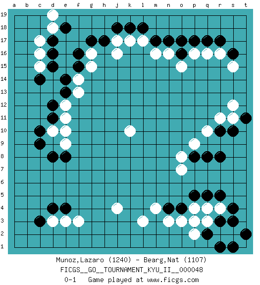 Last move : 0-1 2014 March 27 17:0:50 [Event "FICGS__GO__TOURNAMENT_KYU_II__000048 "] [Site "FICGS"] [Date "2013.10.15"] [Round "1"] [Black "Munoz,Lazaro "] [White "Bearg,Nat "] [Result "0-1"] [Rating 1 "1240"] [Rating 2 "1107"] 1.d16 q3 2.d4 r16 3.p17 d10 4.d12 k10 5.r5 j16 6.m17 j4 7.d8 q10 8.r8 d3 9.c3 e3 10.g17 e9 11.e8 c17 12.d17 c16 13.d15 c15 14.c14 d18 15.e18 d19 16.o4 o3 17.n4 n3 18.r3 p4 19.p5 r4 20.s4 q4 21.q5 r2 22.s3 s2 23.t2 m4 24.q2 p3 25.r1 p2 26.s1 l3 27.e4 f3 28.c10 e11 29.d11 e10 30.c9 e12 31.e13 f13 32.e14 f14 33.f15 g15 34.f16 g16 35.h17 j17 36.j18 k17 37.k18 l17 38.l18 m16 39.n17 n16 40.o16 o15 41.r17 q16 42.q17 p16 43.o17 o7 44.p8 o8 45.q8 p9 46.r10 r11 47.s10 s11 48.t11 s12 49.s16 s15 0-1 This go game has been lost on time (started : 2013.10.15 2:58:6) Here are the names of the openings (joseki) played in the four corners : Corner q16 : r16 p17Komoku (Somok, Xiao~mu`) 3-4 Point. The komoku (3-4) point is the traditional corner enclosure move..Ikken Kakari (Hankan Keolch'im, Yi Gua`jiao~, 1-Space Low Pincer). The small knight move is the basic approach move to the 3-4 point stone. It has been continually used for over four centuries. There are limitless variations, with new moves constantly being discovered. Black 2 opens the door to a treaure store of joseki. Corner q4 : q3 r5Komoku (Somok, Xiao~mu`) 3-4 Point. The komoku (3-4) point is the traditional corner enclosure move..Ikken Kakari (Hankan Keolch'im, Yi Gua`jiao~, 1-Space Low Pincer). The small knight move is the basic approach move to the 3-4 point stone. It has been continually used for over four centuries. There are limitless variations, with new moves constantly being discovered. Black 2 opens the door to a treaure store of joseki. Corner d4 : d4 j4Hoshi (Hwajeom, Seongjeom, Xingwei`) 4-4 Point. The star or hoshi (4-4) point, emphasizing influence at the potential expense of territory. Player White won this Go (weiqi, baduk) game.Follow this game move after move (download ) Don't reduce your own liberties. (Bill Taylor) Man is still the most extraordinary computer of all. (John F. Kennedy)