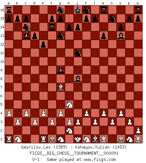 Last move : 0-1 2013 October 18 21:34:49 [Event "FICGS__BIG_CHESS__TOURNAMENT__000091"] [Site "FICGS"] [Date "2013.10.15"] [Round "1"] [White "Gavrilov,Lev"] [Black "Kehayov,Yulian"] [Result "0-1"] [WhiteElo "1389"] [BlackElo "1453"] 1.g2-g3 j15-k13 2.h1-f3 h15-g13 3.j2-k4 h16-l13 4.n2-n3 e15-e13 5.p2-p3 d15-d13 6.d2-d3 f16-c13 7.b2-b3 m15-m13 8.l2-l3 n15-n13 9.f3-q13 l16-n14 10.q13-n13 l13-m12 11.c1-b2 m12-n13 12.b2-n13 o15-o14 13.n13-g7 o16-g9 14.a2-a4 n14-o13 15.e2-e4 c16-k9 16.f2-f3 b16-c14 17.c2-c4 e16-e14 18.g3-g4 e14-f14 19.m2-m4 p16-n15 20.k4-h5 e13-e12 21.k2-k4 k13-j11 22.o2-o4 k9-j8 0-1 Follow this game move after move (download)When I have White, I win because I am white; When I have Black, I win because I am Bogolyubov. (Bogolyubov) Schach ist Kampf, hauptsächlich jedoch gegen die eigenen Fehler. (Savielly Grigorievitsch Tartakower) Sin errores no puede haber brillantez. (Emanuel Lasker) Vouloir jouer aux échecs contre soi-même est aussi paradoxal que vouloir marcher sur son ombre. (Stefan Zweig) Coffee just isn't my cup of tea. (Unknown)