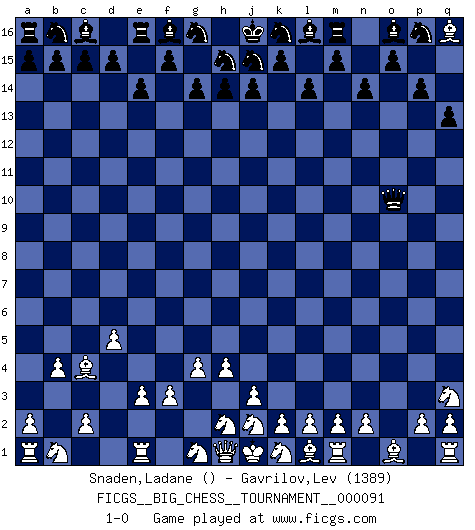 Last move : 1-0 2013 October 19 9:21:57 [Event "FICGS__BIG_CHESS__TOURNAMENT__000091"] [Site "FICGS"] [Date "2013.10.15"] [Round "1"] [White "Snaden,Ladane"] [Black "Gavrilov,Lev"] [Result "1-0"] [WhiteElo ""] [BlackElo "1389"] 1.g2-g4 g15-g14 2.d2-d4 h16-f14 3.f2-f3 f14-d12 4.e2-e3 d12-o2 5.p1-q3 o2-o10 6.h3-h4 e15-e14 7.f1-c4 n15-n14 8.b2-b4 p15-p14 9.c1-b2 l15-l14 10.d4-d5 q15-q13 11.b2-q16 1-0 Follow this game move after move (download)The game of Chess is not merely an idle amusement; several very valuable qualities of the mind are to be acquired and strengthened by it, so as to become habits ready on all occasions; for life is a kind of Chess. (Benjamin Franklin) Die Neutralität betrachte ich als eine schwere Krankheit. (Viktor Kortschnoi) El arma más poderosa en el Ajedrez, es tener la próxima movida. (David Bronstein) Mais l'homme est une créature légère et illogique : semblable au joueur d'échecs, il n'aime que le processus du but à atteindre, non le but lui-même. (Dostoïevsky) Big Chess is a place for big hallucinations. (Thibault de Vassal)