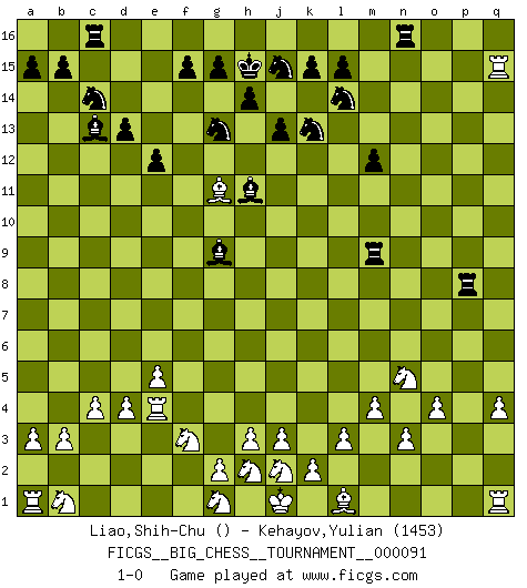 Last move : 1-0 2014 March 28 5:31:57 [Event "FICGS__BIG_CHESS__TOURNAMENT__000091"] [Site "FICGS"] [Date "2013.10.15"] [Round "1"] [White "Liao,Shih-Chu"] [Black "Kehayov,Yulian"] [Result "1-0"] [WhiteElo ""] [BlackElo "1453"] 1.p2-p3 j15-k13 2.o1-p2 h16-o10 3.o2-o3 o10-f2 4.h2-f3 f2-l7 5.l2-l3 l7-c7 6.h1-h2 c7-h2 7.k1-h2 m15-m13 8.m2-m4 h15-g13 9.b2-b3 n15-n13 10.c1-b2 m13-m12 11.c2-c4 e15-e13 12.m1-m3 d15-d13 13.m3-n3 m16-m13 14.d2-d4 f16-c13 15.o3-o4 e13-e12 16.e2-e4 o16-g9 17.p2-h9 m13-m15 18.n3-n13 p16-q14 19.q2-q3 c16-h11 20.n2-n3 m15-m14 21.a2-a3 k16-l14 22.n13-q13 g16-j15 23.b2-c1 q14-p12 24.h9-o15 p12-o14 25.q13-q10 l16-n14 26.o15-n14 m14-n14 27.c1-o12 q16-o16 28.o12-l9 b16-c14 29.p1-o3 n14-n9 30.l9-m10 n9-m9 31.f1-d3 j16-h15 32.e4-e5 o16-n16 33.m10-e3 n16-n9 34.d3-q15 o14-q15 35.q10-q15 p15-p13 36.e3-p13 e16-p16 37.p13-k8 p16-p3 38.o3-n5 p3-p8 39.k8-c15 a16-c16 40.c15-g11 j14-j13 41.e1-e4 n9-n16 42.q3-q4 1-0 Follow this game move after move (download)Who is your opponent tonight, tonight I am playing against the Black pieces. (Akiba Rubinstein) Der Partner hat auch seine Existenzberechtigung. (Savielly Grigorievitsch Tartakower) Mi estilo es algo parecido entre un poco de Tal y Petrosian. (Reshevsky) Je menace de comprendre la position. (Anonyme) Do you know these so called Volunteers don't even get paid! (Simpsons)
