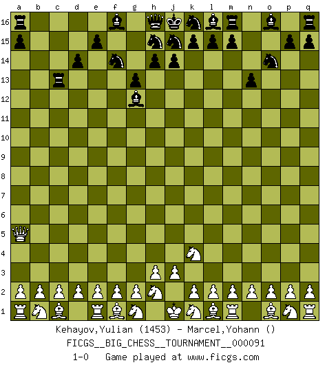 Last move : 1-0 2013 November 26 20:1:0 [Event "FICGS__BIG_CHESS__TOURNAMENT__000091"] [Site "FICGS"] [Date "2013.10.15"] [Round "1"] [White "Kehayov,Yulian"] [Black "Marcel,Yohann"] [Result "1-0"] [WhiteElo "1453"] [BlackElo ""] 1.j2-k4 d15-d14 2.h1-o7 b16-c14 3.o7-f15 g16-f14 4.f15-o7 c16-g12 5.o7-o15 p16-o14 6.o15-b3 n15-n13 7.b3-b15 c14-a13 8.b15-c15 e16-c16 9.c15-a13 c16-c13 10.a13-a7 g15-g13 11.a7-a5 1-0 This big chess game has been lost on time (started : 2013.10.15 3:45:29) Follow this game move after move (download)A great player and a great example for many. His book My 60 Memorable Games had a big impact on me. It is a shame he didn't continue to enrich the world of chess with his unparalleled understanding after 1972. (Jan Timman, about Bobby Fischer's death) Ich habe die Schachforschung dermaßen betrieben, dass sie auf eine wissenschaftliche Basis gestellt wurde. (Mikhail Moiseyevich Botvinik) El ganador de una partida es aquel jugador que hace el penúltimo error. (Savielly Tartakover) Aucun coup ne doit être joué sans but. (Pedro Damiano) Quotation,n.: The act of repeating erroneously the words of another. The words erroneously repeated. (Ambrose Bierce, The Devil's Dictionary)