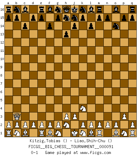 Last move : 0-1 2013 November 20 14:18:32 [Event "FICGS__BIG_CHESS__TOURNAMENT__000091"] [Site "FICGS"] [Date "2013.10.15"] [Round "1"] [White "Kitzig,Tobias"] [Black "Liao,Shih-Chu"] [Result "0-1"] [WhiteElo ""] [BlackElo ""] 1.p2-p3 c15-c14 2.j2-k4 f15-f14 3.h1-o7 h14-h13 4.o7-o15 p16-o14 5.o15-b3 l15-l14 0-1 Follow this game move after move (download)You cannot play at Chess if you are kind-hearted. (French Proverb) Die Leute spielen gegen mich seit 15 Jahren unter Ihren Möglichkeiten. (Robert James Fischer) Si no le temes a Spassky, entonces elimino el elemento del dinero. (Jim Slater) Echiquier : carré parfait, comme la Jérusalem nouvelle décrite par l'auteur de l'Apocalypse, huit cases sur huit, exaltation du chiffre 4, symbole du cosmos aux quatre horizons... où le noir et le blanc, l'ombre et la lumière, le mal et le bien s'entremêlent et se conjuguent. (Robert Couffignal, Le Gambit du poète) A good teacher is like a candle - it consumes itself to light the way for others. (Author unknown)
