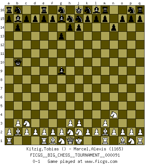 Last move : 0-1 2013 October 28 11:59:8 [Event "FICGS__BIG_CHESS__TOURNAMENT__000091"] [Site "FICGS"] [Date "2013.10.15"] [Round "1"] [White "Kitzig,Tobias"] [Black "Marcel,Alexis"] [Result "0-1"] [WhiteElo ""] [BlackElo "1165"] 1.b2-b3 g15-g13 2.c1-b2 h16-b10 3.k1-l3 b15-b14 4.m2-m3 c16-b15 5.l1-m2 n15-n14 6.b1-c3 o16-g9 7.l3-n4 f16-g15 0-1 Follow this game move after move (download)Some sacrifices are sound; the rest are mine. (Mikhail Tal) Strategie ist, wie man ein Mädchen auf den Rücksitz bekommt. Taktik ist, was man tut, wenn man dann dort ist. (Anonymous) Una buena memoria, concentración, imaginación y una fuerte voluntad, se requiere para llegar a ser un buen jugador. (Bobby Fischer) Les ravages du H expliquent la différence de niveau entre Tal et Thal [Abergel]. Difficult things take a long time, impossible things a little longer. (Author unknown)