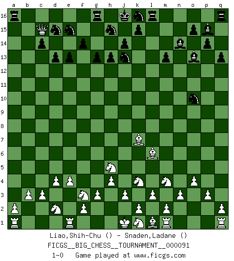 Last move : 1-0 2014 March 4 2:42:24 [Event "FICGS__BIG_CHESS__TOURNAMENT__000091"] [Site "FICGS"] [Date "2013.10.15"] [Round "1"] [White "Liao,Shih-Chu"] [Black "Snaden,Ladane"] [Result "1-0"] [WhiteElo ""] [BlackElo ""] 1.p2-p3 g15-g13 2.o1-p2 h16-d12 3.n2-n3 d15-d13 4.g1-f3 p15-p14 5.c2-c3 c16-p4 6.o2-o3 p4-n6 7.d2-d4 e15-e13 8.p1-n2 o16-p15 9.n2-m4 n6-k9 10.b1-d2 d12-k6 11.g2-g3 k9-c2 12.h2-j4 k6-l7 13.b2-b3 c2-o13 14.l2-l3 m15-m13 15.o3-o4 c15-c14 16.h3-h4 q15-q13 17.c1-b2 l7-k6 18.j4-k6 f16-c13 19.k6-h5 o13-g6 20.j2-k4 l16-p12 21.f1-j4 c13-b12 22.h1-o7 h14-h13 23.p2-k7 p12-n14 24.o7-p6 g6-o13 25.p6-b6 a15-a13 26.b6-l15 m16-l16 27.l15-f10 f15-f14 28.b2-a3 b15-b14 29.f10-b14 e16-e15 30.b14-k6 p16-q14 31.a3-n15 j15-l14 32.n15-p13 q14-p12 33.p13-j7 l14-j13 34.j7-c13 b12-c13 35.k6-c13 e15-g15 36.j4-l6 g16-e15 37.e2-e4 p12-o10 38.c13-b14 b16-d15 39.b14-b15 a16-d16 40.b15-c15 g15-g16 41.c15-a13 d16-a16 42.a13-c15 1-0 This big chess game has been lost on time (started : 2013.10.15 3:45:29) Follow this game move after move (download)Nowadays, when you're not a grandmaster at 14, you can forget about it. (Anand Viswanathan) Das Schach ist nichts für kleine Geister, es beansprucht einen vollen Mann, der sich nicht sklavisch an das Überlieferte hält, sondern selbständig die Tiefen des Spiels zu ergründen sucht. (Wilhelm Steinitz) Cualquier cambio de material en una posición debe venir por medio de un mate, una captura o promoción de Peón. (Purdy) Lorsque vous vous retrouvez devant une position atroce, ne tendez pas un ultime piège dérisoire avec l'intention d'abandonner si l'adversaire le déjoue ! Faites-vous plutôt un devoir de résister comme si votre vie en dépendait. Jouez le coup qui vous déplairait au centuple si vous étiez dans la peau de votre tortionnaire ! Perfection is achieved, not when there is nothing more to add, but when there is nothing left to take away. (Antoine de Saint-Exupéry)
