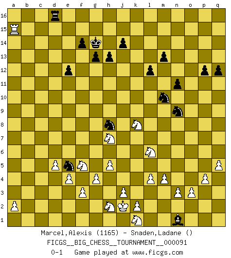 Last move : 0-1 2013 November 9 12:2:59 [Event "FICGS__BIG_CHESS__TOURNAMENT__000091"] [Site "FICGS"] [Date "2013.10.15"] [Round "1"] [White "Marcel,Alexis"] [Black "Snaden,Ladane"] [Result "0-1"] [WhiteElo "1165"] [BlackElo ""] 1.g2-g4 g15-g14 2.h1-a8 d15-d14 3.d2-d3 c16-f13 4.a8-q8 k15-k14 5.h3-h4 n15-n13 6.f1-p10 j15-l14 7.c1-n11 o16-l13 8.n11-l13 k14-l13 9.m2-m4 h16-k14 10.l1-q6 q15-q13 11.n2-n3 e15-e13 12.o1-g8 p16-o14 13.g8-o15 m15-m13 14.o15-p14 n13-n12 15.m1-m3 q16-q14 16.p14-o15 f13-e12 17.p1-o3 k16-m15 18.o15-n14 l14-m12 19.n14-q11 p15-p13 20.p10-l6 e12-l6 21.m3-l3 l6-q11 22.q8-q11 m15-n13 23.q11-l6 b16-c14 24.j2-k4 l13-l12 25.e2-e4 l16-p12 26.l3-k3 k14-c7 27.b1-c3 g16-f14 28.l6-k6 c7-f4 29.f2-f3 f4-d2 30.k4-l6 d2-c2 31.k6-k15 j16-h16 32.k15-l15 m16-n16 33.q6-l11 m12-l14 34.l11-k10 c2-b2 35.k10-f14 h15-f14 36.c3-d5 p12-q11 37.o3-n5 b2-d4 38.g1-h3 q14-q15 39.l15-b6 d4-b6 40.d5-b6 a15-a13 41.a1-b1 f14-g12 42.e1-c1 g12-h10 43.b6-d7 h14-h13 44.b1-b15 c14-d12 45.c1-c15 h16-g16 46.k3-k10 h10-j8 47.k10-f10 n16-n15 48.q1-m1 j8-l7 49.m1-m3 l7-n6 50.m3-k3 d12-f13 51.k3-k6 d14-d13 52.k6-g6 f16-d14 53.c15-d15 d14-c13 54.f10-f13 n15-g15 55.f13-f11 l14-j13 56.d7-e9 f15-f14 57.d15-g15 q15-g15 58.b15-g15 g16-g15 59.h3-j5 e13-e12 60.f11-q11 p13-p12 61.q11-c11 c13-b12 62.c11-c9 a16-c16 63.c9-c16 e16-c16 64.e9-g10 g14-g13 65.g10-f12 d13-d12 66.f12-e14 g15-g14 67.e14-d12 c16-c1 68.j1-j2 n6-p5 69.o2-o3 c1-c2 70.g6-a6 j13-h11 71.d3-d4 n13-m11 72.d12-b11 h11-g9 73.b11-a13 c2-c16 74.a13-b11 n12-n11 75.q2-q4 p5-n6 76.p2-p4 o14-n12 77.l6-k8 n6-l7 78.l2-l4 n12-m10 79.n5-l6 c16-c8 80.b11-a9 c8-c16 81.a9-b7 g9-f7 82.b7-d6 f7-d8 83.a6-a7 l7-k9 84.j5-h7 d8-c6 85.a7-a4 c16-d16 86.d6-f5 b12-n1 87.q4-q5 k9-h8 88.h4-h5 m11-n9 89.d4-d5 c6-e5 90.a4-a15 q13-q12 0-1 Follow this game move after move (download)Fischer is the strongest player in the world. In fact, the strongest player who ever lived. (Larry Evans) Gegen einen Schachcomputer zu verlieren ist wie Löcher in den Strümpfen zuhaben. Es ist nicht peinlich, solange man der einzige ist der es weiß. (Anonymous) Aquel que teme a un Peón de Reina aislado, debería de retirarse del Ajedrez. (Siegbert Tarrasch) Vouloir jouer aux échecs contre soi-même est aussi paradoxal que vouloir marcher sur son ombre. (Stefan Zweig) Be who you are, and say what you feel because those who mind don't matter, and those who matter don't mind. (Dr Seuss)