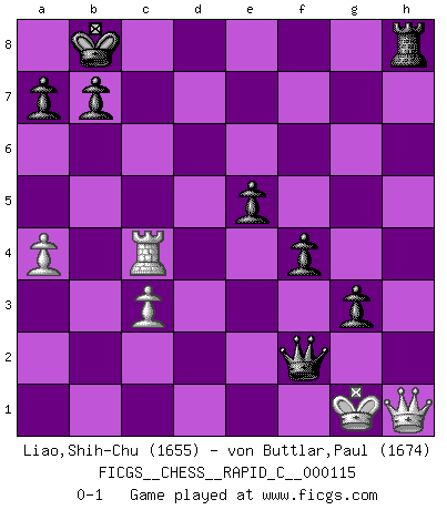 Last move : 0-1 2014 February 12 18:9:8 [Event "FICGS__CHESS__RAPID_C__000115"] [Site "FICGS"] [Date "2013.10.15"] [Round "1"] [White "Liao,Shih-Chu"] [Black "von Buttlar,Paul"] [Result "0-1"] [WhiteElo "1655"] [BlackElo "1674"] 1.e4 e6 2.Nf3 d5 3.e5 c5 4.Bb5+ Bd7 5.Bxd7+ Nxd7 6.Nc3 d4 7.Ne2 Qc7 8.O-O Nxe5 9.Ng3 Nf6 10.Re1 Bd6 11.d3 O-O-O 12.Bg5 h6 13.Bxf6 gxf6 14.Nxe5 Bxe5 15.Re2 h5 16.h3 Bxg3 17.fxg3 Qxg3 18.Qf1 f5 19.Rf2 Rhg8 20.Rf3 Qg5 21.Qf2 Rg7 22.Kh2 Rdg8 23.g3 Qd8 24.Rg1 Qd6 25.c3 dxc3 26.bxc3 h4 27.d4 c4 28.Kh1 hxg3 29.Qg2 f6 30.Rgf1 Rh7 31.Re1 f4 32.Re4 e5 33.Kg1 Rgh8 34.dxe5 fxe5 35.Rxc4+ Kb8 36.a4 Rxh3 37.Rf1 Qb6+ 38.Rf2 Rh1+ 39.Qxh1 Qxf2+ 0-1 French defense Kingside Castling by player White (move 8) Queenside Castling by player Black (move 11) Player Black won this chess game. Follow this game move after move (download)The mistakes are there, waiting to be made. (Savielly Tartakower) Habe Mut, dich deines eigenen Verstandes zu bedienen. (Immanuel Kant) Una mala movida nulifica cuarenta buenas. (Horowitz) Les échecs, c'est l'art d'analyser. (Mikhail Botvinnik) The leaves of memory seemed to make a mournful rustling in the dark. (Henry Wadsworth Longfellow)