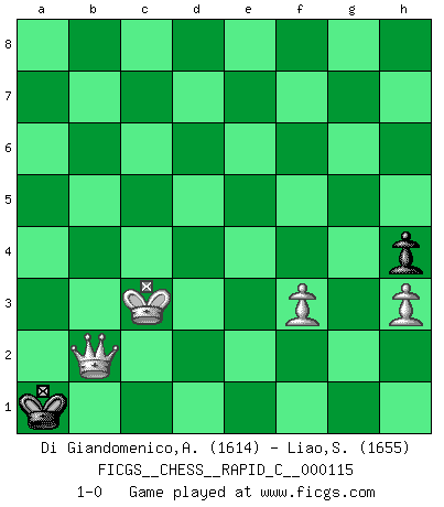 Last move : 1-0 2014 March 6 14:7:44 [Event "FICGS__CHESS__RAPID_C__000115"] [Site "FICGS"] [Date "2013.10.15"] [Round "1"] [White "Di Giandomenico,Alfonso"] [Black "Liao,Shih-Chu"] [Result "1-0"] [WhiteElo "1614"] [BlackElo "1655"] 1.e4 c6 2.d4 d5 3.e5 e6 4.Nf3 h6 5.Bd3 Ne7 6.O-O Nd7 7.Bf4 g5 8.Bg3 b5 9.Nbd2 Bb7 10.c3 a6 11.a4 Nf5 12.Qc2 Nxg3 13.fxg3 Bg7 14.Bg6 O-O 15.Bh5 f6 16.exf6 Rxf6 17.b4 Qc7 18.a5 Raf8 19.Rae1 Rf5 20.Bg4 Rxf3 21.Bxf3 e5 22.dxe5 Nxe5 23.Bh5 Bc8 24.Rxf8+ Bxf8 25.Nf3 Nxf3+ 26.gxf3 Qd6 27.Qg6+ Qxg6 28.Bxg6 Bd7 29.Be8 Bxe8 30.Rxe8 Kf7 31.Rc8 d4 32.cxd4 Bxb4 33.Rxc6 Bxa5 34.Rxa6 Bc3 35.d5 Ke7 36.Kf1 b4 37.Rb6 h5 38.Ke2 Kd7 39.Kd3 Kc7 40.Rc6+ Kd7 41.Rxc3 bxc3 42.Kxc3 Kd6 43.Kd4 h4 44.gxh4 gxh4 45.h3 Ke7 46.Ke5 Kd7 47.d6 Ke8 48.Ke6 Kd8 49.d7 Kc7 50.Ke7 Kc6 51.d8Q Kc5 52.Ke6 Kc4 53.Ke5 Kc3 54.Ke4 Kc4 55.Qd5+ Kc3 56.Ke3 Kc2 57.Qd3+ Kb2 58.Kd4 Kc1 59.Qe2 Kb1 60.Kc3 Ka1 61.Qb2+ 1-0 Caro-Kann : Advance variation Kingside Castling by player White (move 6) Kingside Castling by player Black (move 14) 10 pieces endgame at move 41 : White KRPPPP , Black KPPP WHITE : King + 1 Rook 4 Pawns BLACK : King + 3 Pawns 9 pieces endgame at move 41 : White KPPPP , Black KPPP WHITE : King + 4 Pawns BLACK : King + 3 Pawns 8 pieces endgame at move 42 : White KPPPP , Black KPP WHITE : King + 4 Pawns BLACK : King + 2 Pawns 7 pieces endgame at move 44 : White KPPPP , Black KP WHITE : King + 4 Pawns BLACK : King + 1 Pawn 6 pieces endgame at move 44 : White KPPP , Black KP WHITE : King + 3 Pawns BLACK : King + 1 Pawn Promotion Queen by player White (move 51) Player White won this chess game. Follow this game move after move (download)We cannot resist the fascination of sacrifice, since a passion for sacrifices is part of a Chessplayer's nature. (Rudolf Spielman) Wenn du auf das Glück wartest, wird das Leben ziemlich langweilig. (Mikhail Nekhemyevich Tal) El Ajedrez expande y enriquece tu mente. (Saudin Robovic) À la honte des hommes, on sait que les lois du jeu sont les seules qui soient partout justes, claires, inviolables et exécutées. Pourquoi l'Indien qui a donné les règles du jeu d'échecs est-il obéi de bon gré dans toute la terre, et que les décrétales des papes, par exemple, sont aujourd'hui un objet d'horreur et de mépris ? C'est que l'inventeur des échecs combina tout avec justesse pour la satisfaction des joueurs, et que les papes, dans leurs décrétales, n'eurent en vue que leur seul avantage. L'Indien voulut exercer également l'esprit des hommes et leur donner du plaisir; les papes ont voulu abrutir l'esprit des hommes. Voltaire (Dictionnaire philosophique / Garnier 1967) All the troubles of the world come from being unable to sit alone in a quiet room. (Blaise Pascal)