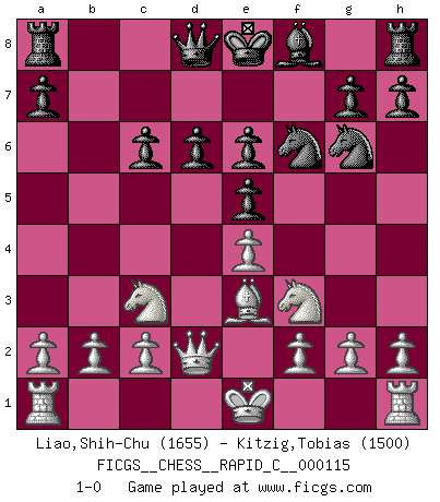 Last move : 1-0 2013 December 30 10:11:5 [Event "FICGS__CHESS__RAPID_C__000115"] [Site "FICGS"] [Date "2013.10.15"] [Round "1"] [White "Liao,Shih-Chu"] [Black "Kitzig,Tobias"] [Result "1-0"] [WhiteElo "1655"] [BlackElo "1500"] 1.e4 e5 2.Nf3 Nc6 3.d4 d6 4.d5 Nce7 5.Bb5+ c6 6.dxc6 bxc6 7.Bc4 Be6 8.Bxe6 fxe6 9.Nc3 Nf6 10.Be3 Ng6 11.Qd2 1-0 This chess game has been lost on time (started : 2013.10.15 3:47:4) Scotch Opening Player White won this chess game. Follow this game move after move (download)It is no time to be playing Chess when the house is on fire. (Italian Proverb) Karpov ist ein Museumsstück. (Garry Kasparov) Tu cuerpo tiene que estar en óptima condición. Tu Ajedrez se deteriora como lo hace tu cuerpo. No puedes separar la mente y el cuerpo. (Bobby Fischer) Les sacrifices démontrent seulement que quelqu'un a gaffé. (Savielly Tartacover) Life is like internet, nothing interesting, but noone want to leave it. (Ilmars Cirulis)