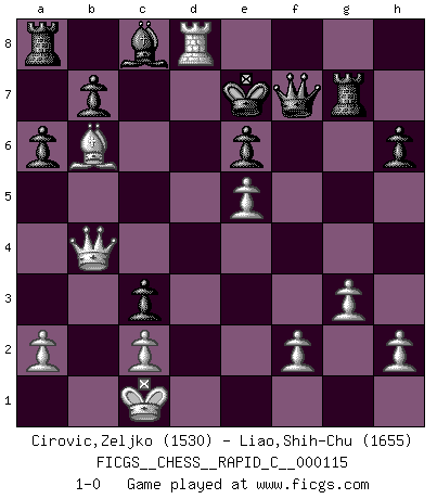 Last move : 1-0 2013 December 14 4:29:2 [Event "FICGS__CHESS__RAPID_C__000115"] [Site "FICGS"] [Date "2013.10.15"] [Round "1"] [White "Cirovic,Zeljko"] [Black "Liao,Shih-Chu"] [Result "1-0"] [WhiteElo "1530"] [BlackElo "1655"] 1.e4 c6 2.d4 d5 3.Nc3 a6 4.exd5 cxd5 5.Nf3 Nc6 6.Be3 h6 7.Bd3 e6 8.Ne5 Nxe5 9.dxe5 Bb4 10.Qh5 Qe7 11.O-O-O Bxc3 12.bxc3 g6 13.Bxg6 fxg6 14.Qxg6+ Qf7 15.Qg4 Rh7 16.g3 Ne7 17.c4 dxc4 18.Bb6 Nc6 19.Rd6 c3 20.Rhd1 Rg7 21.Rd8+ Nxd8 22.Rxd8+ Ke7 23.Qb4+ 1-0 Caro-Kann defense Queenside Castling by player White (move 11) Player White won this chess game. Follow this game move after move (download)I know people who have all the will in the world, but still can't play good Chess. (Bobby Fischer) Er war ein guter Schachspieler, aber ich kann Leute nicht ausstehen, die 'Heil Hitler' rufen (Über Alexander Aljechin). (Miguel Najdorf) Nada excita más a Grandes Maestros aburridos que una novedad teórica. (Dominic Lawson) Votre prénom est 'Tactique', votre deuxième prénom est 'Tactique' et votre nom est 'Tactique'. (Ken Smith) I find your interest interesting. (Gregory House, House M.D.)