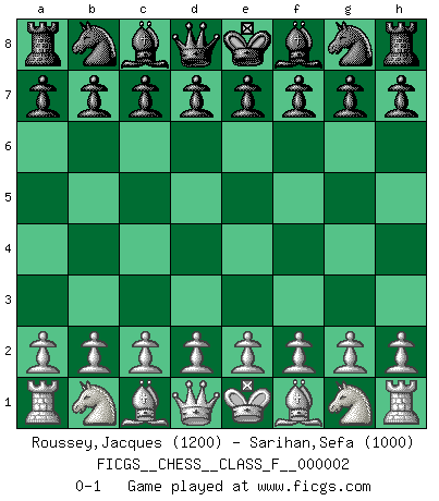 Last move : 0-1 2006 July 3 13:42:19 [Event "FICGS__CHESS__CLASS_F__000002"] [Site "FICGS"] [Date "2006.05.23"] [Round "1"] [White "Roussey,Jacques"] [Black "Sarihan,Sefa"] [Result "0-1"] [WhiteElo "1200"] [BlackElo "1000"] 0-1 Player Black won this chess game. Follow this game move after move (download)Who is your opponent tonight, tonight I am playing against the Black pieces. (Akiba Rubinstein) Fallen sollten polizeilich verboten werden. (Savielly Grigorievitsch Tartakower) En partidas rápidas, el Caballo es mas poderoso que el Alfil. (Vlastimil Hort) On croit qu'il y a plus de mauvais joueurs que de bons joueurs, c'est faux : Il y a autant de joueurs qui gagnent que de joueurs qui perdent. (Philippe Geluck) Nothing is more important for teaching us to understand the concepts we have than constructing fictitious ones. (Ludwig Wittgenstein)