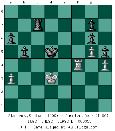 Last move : 0-1 2007 March 4 18:15:13 [Event "FICGS__CHESS__CLASS_E__000033"] [Site "FICGS"] [Date "2007.02.07"] [Round "1"] [White "Stoianov,Stoian"] [Black "Carrizo,Jose"] [Result "0-1"] [WhiteElo "1400"] [BlackElo "1400"] 1.e4 e5 2.Nf3 Nc6 3.Bc4 Bc5 4.c3 Nf6 5.d4 exd4 6.cxd4 Bb4+ 7.Bd2 Bxd2+ 8.Qxd2 Nxe4 9.Qe3 d5 10.Bd3 O-O 11.O-O Re8 12.Ne5 Nxe5 13.dxe5 Qe7 14.Re1 Nc5 15.Bc2 Rd8 16.Rd1 Bg4 17.Rd4 Bh5 18.Nc3 c6 19.Qg3 Bg6 20.Bxg6 fxg6 21.Re1 Rf8 22.Rg4 Rae8 23.f4 Qf7 24.Qe3 Qf5 25.Rg3 Ne6 26.Ne2 Qc2 27.Qc3 Qxc3 28.Rxc3 Nxf4 29.Nxf4 Rxf4 30.Ra3 a6 31.Rb3 Re7 32.e6 Ra4 33.a3 Re4 34.Rxe4 dxe4 35.Rb4 Kf8 36.Rxe4 Ke8 37.Kf2 Kd8 38.g4 h6 39.g5 Kc7 40.Kf3 Kd6 41.Rh4 h5 42.b4 c5 43.bxc5+ Kxc5 44.Re4 Kd5 45.Rf4 b5 46.h4 Kxe6 47.Ke3 Kd5 48.Kd3 Rc7 0-1 Giuoco Piano Kingside Castling by player Black (move 10) Kingside Castling by player White (move 11) Player Black won this chess game. Follow this game move after move (download)Chess is a fighting game which is purely intellectual and includes chance. (Richard Reti) Im Leben werden Partien nie so unstrittig gewonnen wie im Spiel (Emanuel Lasker) Por esta medida (el intervalo entre Fischer y sus contemporaneos), yo le considero el mas grande campeón mundial. (Garry Kasparov) Le système Elo représente seulement une moyenne. Il est simplement un indicateur de votre stabilité. (Anatoli Karpov) Nothing is more important for teaching us to understand the concepts we have than constructing fictitious ones. (Ludwig Wittgenstein)