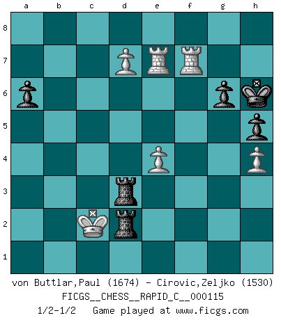 Last move : 1/2-1/2 2014 February 27 5:50:53 [Event "FICGS__CHESS__RAPID_C__000115"] [Site "FICGS"] [Date "2013.10.15"] [Round "1"] [White "von Buttlar,Paul"] [Black "Cirovic,Zeljko"] [Result "1/2-1/2"] [WhiteElo "1674"] [BlackElo "1530"] 1.c4 e5 2.Nc3 f5 3.e4 f4 4.Nf3 d6 5.d4 Bg4 6.Be2 Bxf3 7.Bxf3 Nf6 8.d5 c5 9.Qa4+ Qd7 10.Nb5 Na6 11.Bd2 Be7 12.h3 O-O 13.a3 Nc7 14.Nc3 a6 15.Qxd7 Nxd7 16.O-O-O b5 17.Bg4 Nf6 18.cxb5 Nxb5 19.Bf5 Nxc3 20.Bxc3 g6 21.Be6+ Kg7 22.f3 Ne8 23.Bd7 Ra7 24.Bxe8 Rxe8 25.h4 h5 26.Kc2 Rb7 27.Rdg1 Bf6 28.g3 fxg3 29.Rxg3 Kh7 30.Rg2 Rg8 31.f4 Rf7 32.fxe5 Bxe5 33.Bxe5 dxe5 34.Rg5 Rf2+ 35.Kc3 Rb8 36.b4 cxb4+ 37.axb4 Rf3+ 38.Kc2 Rxb4 39.Rxe5 Ra4 40.Re7+ Kh6 41.d6 Ra2+ 42.Kb1 Rfa3 43.d7 Ra1+ 44.Kb2 R1a2+ 45.Kb1 Rd2 46.Rf1 Rad3 47.R1f7 Rd1+ 48.Kc2 R1d2+ 49.Kc1 Rd1+ 50.Kc2 R1d2+ 51.Kc1 Rd1+ 52.Kc2 R1d2+ 1/2-1/2 English Opening Kingside Castling by player Black (move 12) Queenside Castling by player White (move 16) This chess game ended in a draw. Follow this game move after move (download)The chessboard is the world, the pieces are the phenomena of the Universe, the rules of the game are what we call the laws of Nature and the player on the other side is hidden from us. (Thomas Huxley) Modernes Schach sorgt sich zuviel um Dinge wie Bauernstruktur usw. Vergessen Sie das, Schachmatt beendet das Spiel! (Nigel Short) Hay jugadores fuertes y personas amables y yo soy un jugador fuerte. (Bobby Fischer) Le jeu d'échecs est comme rejeté hors du temps. (Antoine de Saint-Exupéry) If you know the enemy and know yourself you need not fear the results of a hundred battles. (Sun Tzu)