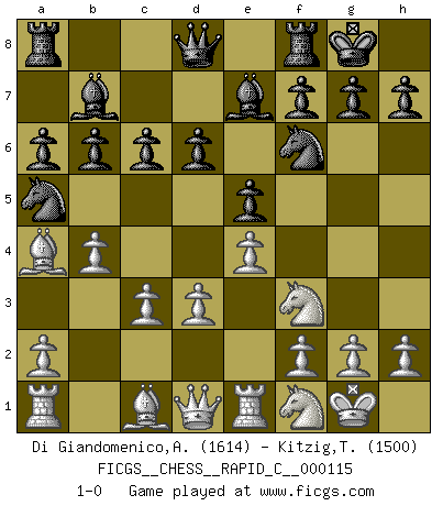 Last move : 1-0 2013 December 7 8:52:2 [Event "FICGS__CHESS__RAPID_C__000115"] [Site "FICGS"] [Date "2013.10.15"] [Round "1"] [White "Di Giandomenico,Alfonso"] [Black "Kitzig,Tobias"] [Result "1-0"] [WhiteElo "1614"] [BlackElo "1500"] 1.e4 e5 2.Bc4 Nf6 3.d3 Nc6 4.c3 d6 5.Nf3 Be7 6.O-O O-O 7.Nbd2 b6 8.Re1 Bb7 9.Nf1 Na5 10.Bb5 a6 11.Ba4 c6 12.b4 1-0 This chess game has been lost on time (started : 2013.10.15 3:47:4) Bishop's Opening : Berlin defense Kingside Castling by player White (move 6) Kingside Castling by player Black (move 6) Player White won this chess game. Follow this game move after move (download)If a ruler does not understand Chess, how can he rule over a kingdom ? (King Khusros II) Mein Name ist Rustam Kamsky. Sie haben meinen Sohn belästigt. Bereiten Sie sich aufs Sterben vor. (Rustam Kamsky) A la fecha, Fischer esta simplemente un nivel arriba de todos los mejores jugadores de Ajedrez del mundo. (John Jacobs) Les écrivains ont utilisé les échecs pour analyser les côtés extrêmes de la nature humaine. Dans ce cadre, les échecs offrent un champ d'expérimentation idéal. Mais on pourrait faire la même chose avec la peinture. Et là, en vous référant à Van Gogh, vous ne tirerez pas de conclusion définitive sur les peintres. (Gary Kasparov) Chess, like love, like music, has the power to make people happy. (Siegbert Tarrasch)