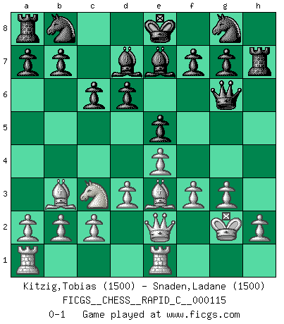 Last move : 0-1 2013 December 1 8:22:13 [Event "FICGS__CHESS__RAPID_C__000115"] [Site "FICGS"] [Date "2013.10.15"] [Round "1"] [White "Kitzig,Tobias"] [Black "Snaden,Ladane"] [Result "0-1"] [WhiteElo "1500"] [BlackElo "1500"] 1.e4 e5 2.Nf3 d6 3.Bc4 Qf6 4.d3 h6 5.O-O Be7 6.Nc3 c6 7.Bd2 Qg6 8.Re1 Bg4 9.Bb3 Bh3 10.g3 Bg4 11.Kg2 h5 12.Be3 h4 13.Nxh4 Rxh4 14.f3 Bd7 15.Qe2 Rh7 0-1 This chess game has been lost on time (started : 2013.10.15 3:47:4) Philidor's defense Kingside Castling by player White (move 5) Player Black won this chess game. Follow this game move after move (download)Checkers is for tramps. (Paul Morphy) Um sich vor der Gefahr einer Erkältung zu schützen, sorge der wanderlustige König beizeiten für ein brauchbares Versteck. (Aaron Nimzowitsch) El Ajedrez es sobre todo, ¡una pelea!. (Emanuel Lasker) Psychologiquement, tu dois avoir confiance en toi même, mais cette confiance doit être basée sur des faits. (Robert Fischer) I can't decide which is riskier; taking crazy risks, or taking advice on crazy risks from a crazy risk taker. (Gregory House in House M.D.)