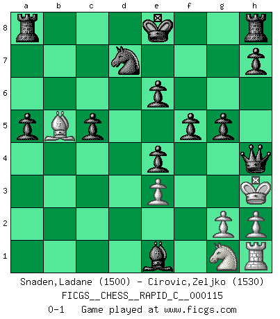 Last move : 0-1 2013 November 15 13:48:43 [Event "FICGS__CHESS__RAPID_C__000115"] [Site "FICGS"] [Date "2013.10.15"] [Round "1"] [White "Snaden,Ladane"] [Black "Cirovic,Zeljko"] [Result "0-1"] [WhiteElo "1500"] [BlackElo "1530"] 1.d4 Nf6 2.c4 e6 3.c5 d5 4.Nc3 b6 5.b4 a5 6.Qa4+ Bd7 7.b5 bxc5 8.Bf4 cxd4 9.Qxd4 Bb4 10.e3 c5 11.Qd2 Ne4 12.Qc2 Bxc3+ 13.Ke2 Bxa1 14.f3 Bxb5+ 15.Ke1 Bc3+ 16.Kd1 Qd7 17.fxe4 Ba4 18.Qxa4 Qxa4+ 19.Ke2 dxe4 20.Kf2 Qxa2+ 21.Kg3 Be1+ 22.Kh3 Qf2 23.Bb5+ Nd7 24.Bg3 Qf5+ 25.Kh4 g5+ 26.Kh5 Qg6+ 27.Kg4 f5+ 28.Kh3 Qh5+ 29.Bh4 Qxh4+ 0-1 Queen's pawn game Player Black won this chess game. Follow this game move after move (download)Chess is a more highly symbolic game, but the aggressions are therefore even more frankly represented in the play. It probably began as a war game; that is, the representation of a miniature battle between the forces of two kingdoms. (Karl Meninger) Ja, jede Frau in Holland liebt mich bestimmt, und alle Männer hassen mich. (Loek van Wely) El Ajedrez es realmente noventa y nueve por ciento calculación. (Soltis) 'L'échange des dames est un coup dur pour les deux adversaires...' Un journaliste lors d'une partie du match Spassky-Fischer Watch your thoughts; they become words. Watch your words; they become actions. Watch your actions; they become habits. Watch your habits; they become character. Watch your character; it becomes your destiny. (Frank Outlaw)