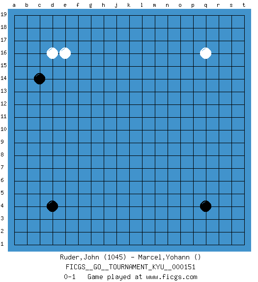Last move : 0-1 2013 December 13 9:19:44 [Event "FICGS__GO__TOURNAMENT_KYU__000151"] [Site "FICGS"] [Date "2013.10.15"] [Round "1"] [Black "Ruder,John"] [White "Marcel,Yohann"] [Result "0-1"] [Rating 1 "1045"] 1.q4 d16 2.d4 q16 3.c14 e16 0-1 This go game has been lost on time (started : 2013.10.15 15:54:29) Here are the names of the openings (joseki) played in the four corners : Corner d16 : d16 c14 Hoshi (Hwajeom, Seongjeom, Xingwei`) 4-4 Point. The star or hoshi (4-4) point, emphasizing influence at the potential expense of territory. Ikken Kakari (Hankan Keolch'im, Yi Gua`jiao~, 1-Space Low Approach). Black 2 is the standard approach move to the 4-4. Player White won this Go (weiqi, baduk) game. Follow this game move after move (download)The rectangular six is normally alive. (Anonymous) Gambling is the son of avarice and the father of despair. (French proverb)