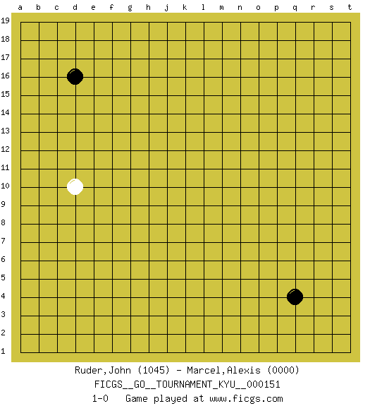 Last move : 1-0 2013 November 7 16:22:20 [Event "FICGS__GO__TOURNAMENT_KYU__000151"] [Site "FICGS"] [Date "2013.10.15"] [Round "1"] [Black "Ruder,John"] [White "Marcel,Alexis"] [Result "1-0"] [Rating 1 "1045"] [Rating 2 "0000"] 1.q4 d10 2.d16 1-0 Here are the names of the openings (joseki) played in the four corners : Player Black won this Go (weiqi, baduk) game. Follow this game move after move (download)I really believe that Go is destined to take the place of Chess as the leading intellectual game of the Occident, just as it has reigned supreme in the Orient for some four thousand years. (Edward Lasker, international chess master) First of all, we have to go back to the classical time control. (Anatoly Karpov)