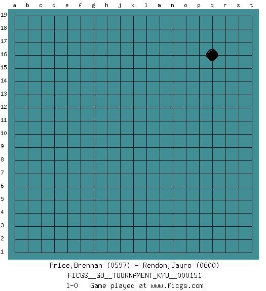 Last move : 1-0 2013 November 14 18:37:25 [Event "FICGS__GO__TOURNAMENT_KYU__000151"] [Site "FICGS"] [Date "2013.10.15"] [Round "1"] [Black "Price,Brennan"] [White "Rendon,Jayro"] [Result "1-0"] [Rating 1 "0597"] [Rating 2 "0600"] 1.q16 1-0 This go game has been lost on time (started : 2013.10.15 15:54:29) Here are the names of the openings (joseki) played in the four corners : Player Black won this Go (weiqi, baduk) game. Follow this game move after move (download)You have to like to win, and to learn to recognize the errors that gave you the victory. (Pierre Audouard) There is far too much law for those who can afford it and far too little for those who cannot. (Derek Bok)