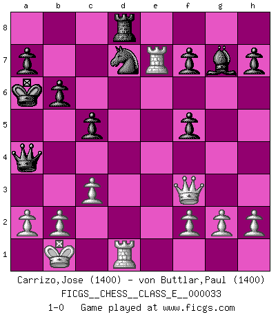 Last move : 1-0 2007 March 24 12:18:5 [Event "FICGS__CHESS__CLASS_E__000033"] [Site "FICGS"] [Date "2007.02.07"] [Round "1"] [White "Carrizo,Jose"] [Black "von Buttlar,Paul"] [Result "1-0"] [WhiteElo "1400"] [BlackElo "1400"] 1.e4 e6 2.d4 d5 3.Nc3 dxe4 4.Nxe4 Nf6 5.Nxf6+ gxf6 6.Nf3 b6 7.Bf4 Bb7 8.Bb5+ c6 9.Bd3 Nd7 10.Qe2 Qe7 11.O-O-O O-O-O 12.Kb1 Bg7 13.Nh4 Qb4 14.c3 Qa5 15.Rhe1 c5 16.Bg3 f5 17.d5 Bxd5 18.Ba6+ Bb7 19.Bxb7+ Kxb7 20.Qf3+ Ka6 21.Bc7 Qa4 22.Bxd8 Rxd8 23.Nxf5 exf5 24.Re7 1-0 French : Rubinstein variation Queenside Castling by player White (move 11) Queenside Castling by player Black (move 11) Player White won this chess game. Follow this game move after move (download)I have never in my life played the French Defence, which is the dullest of all openings. (Wilhelm Steinitz) Habe Mut, dich deines eigenen Verstandes zu bedienen. (Immanuel Kant) Buenas posiciones no logran ganar juegos, buenas movidas sí. (Gerald Abrahams) Les échecs, c'est l'art d'analyser. (Mikhail Botvinnik) Cactus - It is depressed cucumber. (Ilmars Cirulis)