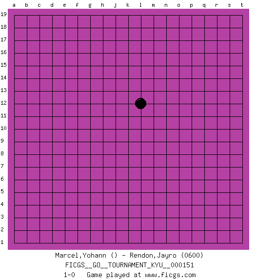 Last move : 1-0 2013 November 14 18:37:25 [Event "FICGS__GO__TOURNAMENT_KYU__000151"] [Site "FICGS"] [Date "2013.10.15"] [Round "1"] [Black "Marcel,Yohann"] [White "Rendon,Jayro"] [Result "1-0"] [Rating 2 "0600"] 1.l12 1-0 This go game has been lost on time (started : 2013.10.15 15:54:29) Here are the names of the openings (joseki) played in the four corners : Player Black won this Go (weiqi, baduk) game. Follow this game move after move (download)When your opponent has two weak groups, attack them both at once. (Anonymous) Experiences are the keys to life. (Daniel Parmet)