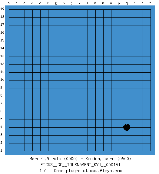 Last move : 1-0 2013 November 14 18:37:25 [Event "FICGS__GO__TOURNAMENT_KYU__000151"] [Site "FICGS"] [Date "2013.10.15"] [Round "1"] [Black "Marcel,Alexis"] [White "Rendon,Jayro"] [Result "1-0"] [Rating 1 "0000"] [Rating 2 "0600"] 1.q4 1-0 This go game has been lost on time (started : 2013.10.15 15:54:29) Here are the names of the openings (joseki) played in the four corners : Corner q4 : q4 1-0 Hoshi (Hwajeom, Seongjeom, Xingwei`) 4-4 Point. The star or hoshi (4-4) point, emphasizing influence at the potential expense of territory. Player Black won this Go (weiqi, baduk) game. Follow this game move after move (download)Win the stones, lose the game. (Anonymous) A shortcut is the longest distance between two points. (Don Groves)