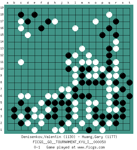 Last move : 0-1 2014 February 12 6:52:6 [Event "FICGS__GO__TOURNAMENT_KYU_I__000050"] [Site "FICGS"] [Date "2013.10.16"] [Round "1"] [Black "Denisenkov,Valentin"] [White "Huang,Gary"] [Result "0-1"] [Rating 1 "1130"] [Rating 2 "1177"] 1.q16 r14 2.d4 q4 3.d17 o17 4.p15 l16 5.q13 r13 6.q12 r11 7.q11 r10 8.r15 q18 9.r17 d15 10.f16 c17 11.c18 c16 12.e18 c11 13.o3 q6 14.r8 q9 15.r5 q5 16.r6 q7 17.s3 r4 18.s4 r7 19.s7 s6 20.s5 s8 21.t6 l3 22.h3 c6 23.c5 d6 24.f4 h17 25.g17 c3 26.b4 e3 27.d3 d2 28.e2 f2 29.c2 e1 30.b3 e4 31.k4 l4 32.k5 l5 33.k3 q2 34.s9 r9 35.t8 k6 36.j6 j7 37.l6 k7 38.m6 n4 39.o4 n5 40.n6 o5 41.n8 h6 42.j5 f5 43.h5 g6 44.g5 g4 45.h4 f3 46.l2 m2 47.j2 l1 48.k1 k2 49.r3 j1 50.q3 o2 51.p2 p1 52.p3 n3 53.n1 o10 54.g3 h1 55.r2 l10 56.n10 n9 57.m9 o9 58.m10 l8 59.m8 n12 60.m12 m13 61.l11 k11 62.k10 l9 63.k12 n11 64.l7 m11 65.p8 q8 66.o8 l12 67.p9 p10 68.q10 o11 0-1 Here are the names of the openings (joseki) played in the four corners : Corner q16 : q16 r14 Hoshi (Hwajeom, Seongjeom, Xingwei`) 4-4 Point. The star or hoshi (4-4) point, emphasizing influence at the potential expense of territory. Ikken Kakari (Hankan Keolch'im, Yi Gua`jiao~, 1-Space Low Approach). White 2 is the standard approach move to the 4-4. Corner d16 : d17 d15 Komoku (Somok, Xiao~mu`) 3-4 Point. The komoku (3-4) point is the traditional corner enclosure move.. Ikken Takagakari (Hankan Nop'dakeolch'im, Yi Gaogua`jiao~, 1-Space High Approach). The 5-4 approach move has become more popular in modern times, as modern Go emphasizes speed and influence. Corner q4 : q4 o3 Hoshi (Hwajeom, Seongjeom, Xingwei`) 4-4 Point. The star or hoshi (4-4) point, emphasizing influence at the potential expense of territory. Ikken Kakari (Hankan Keolch'im, Yi Gua`jiao~, 1-Space Low Approach). Black 2 is the standard approach move to the 4-4. Player White won this Go (weiqi, baduk) game. Follow this game move after move (download)There are possible things, impossible things, and things that happen. Sometimes things happen that were impossible. (Pierre Audouard) May I never be complete. May I never be content. May I never be perfect. Deliver me, Tyler, from being perfect and complete. (Chuck Palahniuk, Fight Club)