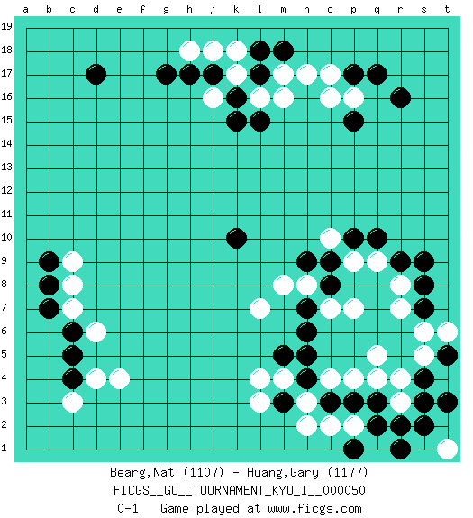 Last move : 0-1 2014 March 27 4:55:10 [Event "FICGS__GO__TOURNAMENT_KYU_I__000050"] [Site "FICGS"] [Date "2013.10.16"] [Round "1"] [Black "Bearg,Nat"] [White "Huang,Gary"] [Result "0-1"] [Rating 1 "1107"] [Rating 2 "1177"] 1.q3 q5 2.d17 r3 3.c4 e4 4.r16 c3 5.c5 d4 6.k10 q4 7.p3 o4 8.o3 n3 9.n4 p4 10.m3 n2 11.r2 m4 12.n5 l3 13.s3 r4 14.s4 o2 15.q2 s5 16.k16 t4 17.s2 p2 18.t3 q1 19.t5 s6 20.r1 t1 21.p1 d6 22.c6 c7 23.b7 c8 24.b8 c9 25.b9 p16 26.p17 o17 27.q17 o16 28.p15 k17 29.l17 l16 30.j17 k18 31.l18 j16 32.k15 j18 33.h17 h18 34.g17 m17 35.m18 n17 36.l15 m16 37.s7 r7 38.s8 r8 39.s9 t6 40.r9 q9 41.q10 p9 42.p10 o10 43.o9 p7 44.o8 o7 45.n7 n8 46.n9 m8 47.n6 l7 48.m5 l4 0-1 This go game has been lost on time (started : 2013.10.16 9:49:18) Here are the names of the openings (joseki) played in the four corners : Corner q4 : q3 q5 Komoku (Somok, Xiao~mu`) 3-4 Point. The komoku (3-4) point is the traditional corner enclosure move.. Ikken Takagakari (Hankan Nop'dakeolch'im, Yi Gaogua`jiao~, 1-Space High Approach). The 5-4 approach move has become more popular in modern times, as modern Go emphasizes speed and influence. Corner d4 : c4 e4 Komoku (Somok, Xiao~mu`) 3-4 Point. The komoku (3-4) point is the traditional corner enclosure move.. Ikken Takagakari (Hankan Nop'dakeolch'im, Yi Gaogua`jiao~, 1-Space High Approach). The 5-4 approach move has become more popular in modern times, as modern Go emphasizes speed and influence. Corner q16 : r16 p16 Komoku (Somok, Xiao~mu`) 3-4 Point. The komoku (3-4) point is the traditional corner enclosure move.. Ikken Takagakari (Hankan Nop'dakeolch'im, Yi Gaogua`jiao~, 1-Space High Approach). The 5-4 approach move has become more popular in modern times, as modern Go emphasizes speed and influence. Player White won this Go (weiqi, baduk) game. Follow this game move after move (download)Atari, atari is vulgar play. (Anonymous) Warrior pose battles inner weakness and wins focus. You see that there is no war within you. You're on your own side, and you are your own strength. (Terri Guillemets)