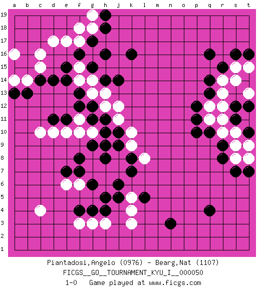 Last move : 1-0 2014 March 28 17:39:32 [Event "FICGS__GO__TOURNAMENT_KYU_I__000050"] [Site "FICGS"] [Date "2013.10.16"] [Round "1"] [Black "Piantadosi,Angelo"] [White "Bearg,Nat"] [Result "1-0"] [Rating 1 "0976"] [Rating 2 "1107"] 1.q16 d17 2.q4 c4 3.q10 c10 4.k16 k3 5.n3 k10 6.g17 r10 7.r9 r11 8.q13 q11 9.p10 s9 10.r8 s8 11.e15 c16 12.c14 e17 13.f16 f17 14.h16 c15 15.d14 b14 16.b13 a14 17.a13 a16 18.p11 q12 19.p12 r13 20.q14 r14 21.r15 s15 22.s16 t15 23.t16 s14 24.s7 t8 25.t7 s10 26.t10 t11 27.t12 t9 28.s12 r12 29.s11 t13 30.t10 g18 31.h18 g19 32.h19 f18 33.l5 k5 34.k7 j7 35.k8 j8 36.j9 h9 37.j10 j11 38.h10 g10 39.h11 k9 40.g11 f10 41.d11 d10 42.e11 e10 43.j6 h6 44.j5 k4 45.f4 f3 46.g4 g3 47.h4 h3 48.h8 h7 49.g9 g8 50.h9 f11 51.f12 j12 52.j14 h12 53.g12 h13 54.h14 g13 55.f13 g14 56.g15 f14 57.e14 f15 58.f8 g7 59.f7 f6 60.h5 l8 61.g6 e6 62.e7 1-0 This go game has been lost on time (started : 2013.10.16 9:49:18) Here are the names of the openings (joseki) played in the four corners : Corner d16 : d17 g17 Komoku (Somok, Xiao~mu`) 3-4 Point. The komoku (3-4) point is the traditional corner enclosure move.. Corner q16 : q16 r11 Hoshi (Hwajeom, Seongjeom, Xingwei`) 4-4 Point. The star or hoshi (4-4) point, emphasizing influence at the potential expense of territory. Player Black won this Go (weiqi, baduk) game. Follow this game move after move (download)Those who are good at winning, don't usually fight. (Zhang) CHESS, n. f. [echecs, Fr.] A nice and abstruse game, in which two sets of puppets are moved in opposition to each other. (Dr Samuel Johnson, A Dictionary Of The English Language, 1755)