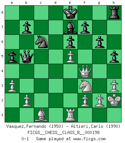 Last move : 0-1 2014 March 26 4:52:45 [Event "FICGS__CHESS__CLASS_B__000198"] [Site "FICGS"] [Date "2013.10.17"] [Round "1"] [White "Vasquez,Fernando"] [Black "Altieri,Carlo"] [Result "0-1"] [WhiteElo "1950"] [BlackElo "1990"] 1.e4 c5 2.c3 Nf6 3.e5 Nd5 4.Nf3 d6 5.d4 cxd4 6.cxd4 dxe5 7.dxe5 Nc6 8.Bc4 Ndb4 9.Qb3 e6 10.O-O Na5 11.Bb5+ Bd7 12.Qa4 Bxb5 13.Qxb5+ Nac6 14.Nc3 a6 15.Qc4 Qd3 16.Qg4 h5 17.Qg3 Qc4 18.Rd1 Rd8 19.Rxd8+ Nxd8 20.Bg5 Ndc6 21.Re1 Nd5 22.Nxd5 Qxd5 23.a3 Qb3 24.Bc1 g6 25.Qf4 Be7 26.h3 a5 27.Qe3 Qb5 28.Kh2 Bc5 29.Qf4 Be7 0-1 This chess game has been lost on time (started : 2013.10.17 21:51:38) Sicilian : Alapin's variation (2.c3) Kingside Castling by player White (move 10) Player Black won this chess game. Follow this game move after move (download)Fischer sacrificed virtually everything most of us weakies (to use his term) value, respect, and cherish, for the sake of an artful, often beautiful board game, for the ambivalent privilege of being its greatest master. (Paul Kollar) Ich las kürzlich ein Buch von Nietzsche. Er sagte Religion verdumme nur die Menschen. Ich stimme zu. (Robert James Fischer) Cuando tu no sabes absolutamente que mas hacer, es tiempo de entrar en pánico. (John van der Wiel) Tous ces prétendus hommes politiques sont les pions, les Cavaliers, les Tours ou les Fous d'une partie d'échecs qui se jouera tant qu'un hasard ne renversera pas l'échiquier. (Honoré de Balzac) Never risk one's whole fortune unless supported by one's entire army. (Niccolo Machiavelli)