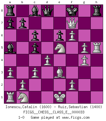 Last move : 1-0 2007 March 13 1:25:31 [Event "FICGS__CHESS__CLASS_E__000033"] [Site "FICGS"] [Date "2007.02.07"] [Round "1"] [White "Ionescu,Catalin"] [Black "Ruiz,Sebastian"] [Result "1-0"] [WhiteElo "1600"] [BlackElo "1400"] 1.e4 Nf6 2.e5 Nd5 3.d4 Nc6 4.Nf3 h6 5.Bc4 e6 6.Bxd5 g5 7.h3 Bb4+ 8.c3 Ba5 9.Bxc6 dxc6 10.Be3 O-O 11.h4 c5 12.a3 c6 13.hxg5 h5 14.Rxh5 Kg7 15.Qd3 Rh8 16.g4 f5 17.exf6+ Kf7 18.Ne5+ Ke8 19.Qg6+ Kf8 20.Qf7+ 1-0 Alekhine's defense Kingside Castling by player Black (move 10) Player White won this chess game. Follow this game move after move (download)A Chess game is a dialogue, a conversation between a player and his opponent. Each move by the opponent may contain threats or be a blunder, but a player cannot defend against threats or take advantage of blunders if he does not first ask himself: What is my opponent planning after each move ? (Bruce A. Moon) Meine Liebe ist Schach, Schach, Schach. Ich muss jeden Tag Schach spielen, deshalb fühle ich mich so stark. (Miguel Najdorf) Haz el enroque temprano y seguido. (Rob Sillars) Votre prénom est 'Tactique', votre deuxième prénom est 'Tactique' et votre nom est 'Tactique'. (Ken Smith) The Internet is the first thing that humanity has build that humanity doesn't understand, the largest experiment in anarchy that we have ever had. (Eric Schmidt)