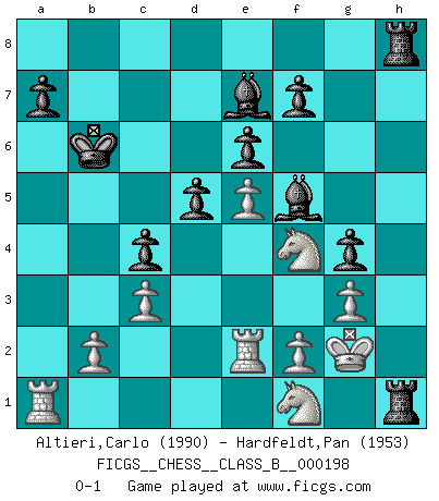 Last move : 0-1 2013 November 5 20:56:44 [Event "FICGS__CHESS__CLASS_B__000198"] [Site "FICGS"] [Date "2013.10.17"] [Round "1"] [White "Altieri,Carlo"] [Black "Hardfeldt,Pan"] [Result "0-1"] [WhiteElo "1990"] [BlackElo "1953"] 1.e4 c6 2.d4 d5 3.e5 Bf5 4.Nf3 e6 5.Be2 Nd7 6.O-O h6 7.Nbd2 Qc7 8.Nb3 g5 9.a4 O-O-O 10.Bd2 Kb8 11.Re1 Ne7 12.Ba5 b6 13.Bb4 c5 14.dxc5 bxc5 15.Ba5 Nb6 16.Bb5 Nc6 17.c3 Be7 18.Qe2 g4 19.Nfd2 Rhg8 20.g3 h5 21.Bxb6 Qxb6 22.a5 Qc7 23.Ba4 c4 24.Bxc6 Bd3 25.Qd1 Qxc6 26.Nd4 Qa6 27.Qa4 Rc8 28.Ra2 Ka8 29.Qd7 Qb7 30.Qxb7+ Kxb7 31.Ne2 h4 32.Nf4 hxg3 33.hxg3 Bh7 34.a6+ Kc7 35.Kg2 Rb8 36.Nf1 Bf5 37.Re2 Rh8 38.Kg1 Rh7 39.Ra4 Rbh8 40.Ra1 Kb6 41.Kg2 Rh1 42.Rae1 Kxa6 43.Ra1+ Kb6 0-1 Caro-Kann : Advance variation Kingside Castling by player White (move 6) Queenside Castling by player Black (move 9) Player Black won this chess game. Follow this game move after move (download)Chess is a terrific way for kids to build self image and self esteem. (Saudin Robovic) Wer mein Gambit spielt, muß bereit sein, alle Brücken hinter sich abzubrechen. Es verändert den ganzen Menschen. Es wirkt wie ein Zauberstab und fördert verkümmerte, gute Charakter- eigenschaften wieder zu Tage. (Emil Joseph Diemer) La batalla por la última verdad nunca sera ganada. Y es por eso que el Ajedrez es tan fascinante. (Hans Kmoch) Aux échecs, les retours au sommet sont rares : les dommages psychologiques consécutifs à une défaite sont trop sévères. (Daily Telegraph) Vladimir Ras-Putin is still alive... He is also a good actor, I saw him in the Lord of the Rings. (Rodolfo d'Ettorre)