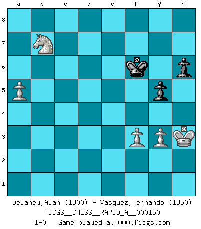 Last move : 1-0 2014 April 21 3:2:13 [Event "FICGS__CHESS__RAPID_A__000150"] [Site "FICGS"] [Date "2013.10.18"] [Round "1"] [White "Delaney,Alan"] [Black "Vasquez,Fernando"] [Result "1-0"] [WhiteElo "1900"] [BlackElo "1950"] 1.Nf3 Nf6 2.g3 g6 3.Bg2 Bg7 4.O-O O-O 5.d4 d5 6.c4 dxc4 7.Na3 c3 8.bxc3 c5 9.e3 Nc6 10.Qe2 Bg4 11.Bb2 Qd7 12.Rad1 Rfd8 13.Rfe1 Ne8 14.Nc4 b5 15.h3 Bxf3 16.Qxf3 Rac8 17.Nd2 cxd4 18.cxd4 Nd6 19.Nb3 Qc7 20.Ba3 Na5 21.Bb4 Nac4 22.Rc1 Qb6 23.Qe2 e5 24.Red1 a5 25.Bc5 Qb8 26.dxe5 Bxe5 27.Bxd6 Bxd6 28.Nd4 Ba3 29.Rc2 Bc5 30.Nc6 Rxd1+ 31.Qxd1 Qb6 32.Qd7 Rc7 33.Qe8+ Bf8 34.Bd5 Nd6 35.Qe5 h6 36.h4 Nc4 37.Qf6 Kh7 38.h5 Qc5 39.hxg6+ fxg6 40.Qe6 Rg7 41.Bxc4 bxc4 42.Rxc4 Qb6 43.Rf4 Ba3 44.Rd4 Be7 45.a4 Qb1+ 46.Kg2 Bc5 47.Rd7 Rxd7 48.Qxd7+ Kh8 49.Qe8+ Kh7 50.Qf7+ Kh8 51.Qf4 Kh7 52.Nxa5 Qc2 53.Qc7+ Kh8 54.Qc8+ Kg7 55.Nb7 Qe4+ 56.f3 Qxe3 57.Qxc5 Qd2+ 58.Qf2 Qb4 59.Nc5 Kf8 60.Qe3 Qb2+ 61.Kh3 Qb1 62.Qf4+ Kg8 63.Qc4+ Kf8 64.Qd5 g5 65.Qa8+ Kg7 66.Qb7+ Qxb7 67.Nxb7 Kf6 68.a5 1-0 Reti : King's Indian attack Kingside Castling by player White (move 4) Kingside Castling by player Black (move 4) 10 pieces endgame at move 57 : White KQNPPP , Black KQPP WHITE : King + 1 Queen 1 Knight 3 Pawns BLACK : King + 1 Queen 2 Pawns 9 pieces endgame at move 66 : White KNPPP , Black KQPP WHITE : King + 1 Knight 3 Pawns BLACK : King + 1 Queen 2 Pawns 8 pieces endgame at move 67 : White KNPPP , Black KPP WHITE : King + 1 Knight 3 Pawns BLACK : King + 2 Pawns Player White won this chess game. Follow this game move after move (download)When I asked Fischer why he had not played a certain move in our game, he replied: 'Well, you laughed when I wrote it down !' (Mikhail Tal) Lisa Lane, amerikanische Schachmeisterin, hatte Fischer einmal als stärksten lebenden Spieler bezeichnet. Antwort: Das ist richtig, aber Lisa Lane ist eigentlich nicht in der Lage, das zu beurteilen. (Robert James Fischer) El Rey es una pieza de pelea. ¡Usenlo!. (Wilhelm Steinitz) On est toujours la mazette de quelqu'un d'autre. (Anonyme) Go and wake up your luck. (Persian saying)