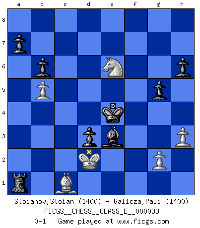 Last move : 0-1 2007 March 16 21:16:59 [Event "FICGS__CHESS__CLASS_E__000033"] [Site "FICGS"] [Date "2007.02.07"] [Round "1"] [White "Stoianov,Stoian"] [Black "Galicza,Pali"] [Result "0-1"] [WhiteElo "1400"] [BlackElo "1400"] 1.e4 b6 2.d4 d5 3.Nc3 e6 4.e5 h6 5.Nf3 Ne7 6.Be2 Ng6 7.O-O Be7 8.Bd3 O-O 9.Bxg6 fxg6 10.Qd3 Kh7 11.Ne2 c5 12.Nf4 Rxf4 13.Bxf4 Ba6 14.Qd2 Bxf1 15.Kxf1 g5 16.Qd3+ g6 17.Bd2 Nc6 18.c4 cxd4 19.b4 g4 20.Ne1 Nxe5 21.Qxd4 Bf6 22.Qf4 g5 23.Qg3 Nxc4 24.Bc3 Nd2+ 25.Bxd2 Bxa1 26.Qxg4 Qf6 27.b5 Bd4 28.Nf3 Bc5 29.a4 Rf8 30.Be1 Qf5 31.Qxf5+ Rxf5 32.h3 e5 33.Bc3 Rf4 34.Bd2 Rxa4 35.Nxe5 Bd4 36.Nc6 Bc5 37.Nd8 Kg6 38.Ne6 Kf5 39.Nc7 Ke4 40.Ke2 d4 41.Ne6 d3+ 42.Kd1 Ra1+ 43.Bc1 Bxf2 44.Kd2 Be3+ 0-1 Owen defense Kingside Castling by player White (move 7) Kingside Castling by player Black (move 8) Player Black won this chess game. Follow this game move after move (download)Chess makes man wiser and clear-sighted. (Vladimir Putin) Um dein Spiel zu verbessern musst du zuallererst das Endspiel studieren, denn diese kann unabhängig studiert werden. Die Eröffnung und das Mittelspiel müssen immer in Bezug gesetzt werden zum Endspiel. (José Raúl Capablanca) Yo no le temo a Spassky. Todos saben que yo soy el mejor. Uno no necesita un torneo para probarlo. (Bobby Fischer) Karpov est une pièce de musée. (Garry Kasparov) Go and wake up your luck. (Persian saying)