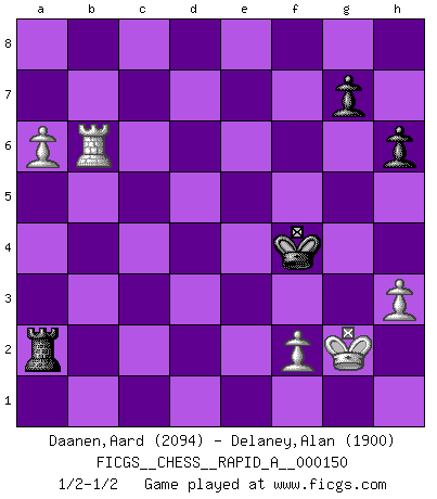 Last move : 1/2-1/2 2014 January 10 0:43:47 [Event "FICGS__CHESS__RAPID_A__000150"] [Site "FICGS"] [Date "2013.10.18"] [Round "1"] [White "Daanen,Aard"] [Black "Delaney,Alan"] [Result "1/2-1/2"] [WhiteElo "2094"] [BlackElo "1900"] 1.e4 d6 2.d4 Nf6 3.Nc3 e5 4.Nf3 Nbd7 5.Bc4 Be7 6.O-O O-O 7.a4 c6 8.Re1 Qe8 9.h3 Bd8 10.a5 Qe7 11.Be3 Re8 12.Qd2 h6 13.Ba2 Bc7 14.b4 a6 15.Bb3 Rd8 16.d5 Nf8 17.Nh2 Ng6 18.Nf1 Nh5 19.Ne2 Qh4 20.Nh2 Bd7 21.Qd3 Rac8 22.dxc6 Bxc6 23.Nc3 Bb8 24.Bb6 Rf8 25.Nf3 Qe7 26.g3 Kh8 27.Rad1 f5 28.Nd5 Bxd5 29.Bxd5 Nf6 30.exf5 Nxd5 31.Qxd5 Rxf5 32.Nd2 Rg5 33.Be3 Nf4 34.Bxf4 exf4 35.Rxe7 Rxd5 36.gxf4 Rxc2 37.Re8+ Kh7 38.Rxb8 Kg6 39.Rxb7 R5xd2 40.Rxd2 Rxd2 41.Rb6 Rd4 42.Rxa6 Rxb4 43.Rxd6+ Kf5 44.a6 Ra4 45.Kf1 Ra2 46.Kg2 Kxf4 47.Rb6 1/2-1/2 Pirc defense Kingside Castling by player White (move 6) Kingside Castling by player Black (move 6) 10 pieces endgame at move 43 : White KRPPPP , Black KRPP WHITE : King + 1 Rook 4 Pawns BLACK : King + 1 Rook 2 Pawns 9 pieces endgame at move 46 : White KRPPP , Black KRPP WHITE : King + 1 Rook 3 Pawns BLACK : King + 1 Rook 2 Pawns This chess game ended in a draw. Follow this game move after move (download)Before the endgame, the Gods have placed the middle game. (Siegbert Tarrasch) Bobby Fischer ist kein Vorbild für die heutige Jugend. (Viktor Kortschnoi) Ciertamente el estado mental actual de Bobby Fischer es una tragedia. Uno de los mas grandes jugadores de Ajedrez del mundo -el orgullo y pena del Ajedrez Americano. (Frank Brady) Les pièces de l'échiquier étaient impitoyables. Elles le retenaient, elles l'absorbaient. Il y avait de l'horreur en cela, mais aussi une harmonie unique. Car, qu'y a-t-il dans le monde, à part les échecs ? (V. Nabokov) You have to believe in yourself. (Sun Tzu)