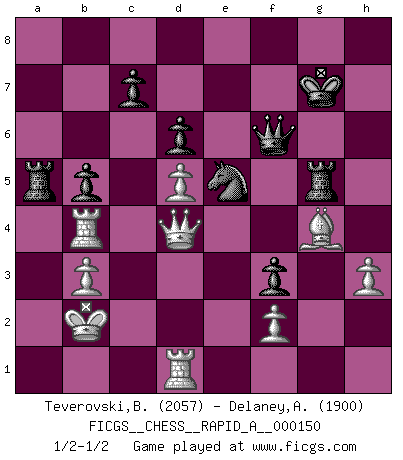 Last move : 1/2-1/2 2014 March 25 14:31:39 [Event "FICGS__CHESS__RAPID_A__000150"] [Site "FICGS"] [Date "2013.10.18"] [Round "1"] [White "Teverovski,Bogoljub"] [Black "Delaney,Alan"] [Result "1/2-1/2"] [WhiteElo "2057"] [BlackElo "1900"] 1.c4 e5 2.Nc3 Nf6 3.g3 Bb4 4.Bg2 O-O 5.Nf3 Re8 6.O-O e4 7.Nd4 Nc6 8.Nc2 Bxc3 9.dxc3 h6 10.Ne3 d6 11.Qc2 a5 12.Bd2 Ne5 13.Bxe4 Nxc4 14.Bg2 Nxd2 15.Qxd2 Ne4 16.Qd4 Nc5 17.Rfd1 a4 18.Rd2 Be6 19.c4 Ra6 20.Re1 Rb6 21.Qc3 h5 22.Rd4 g6 23.Nd5 Bxd5 24.cxd5 Qf6 25.e3 h4 26.gxh4 Kg7 27.Rc1 Rh8 28.Rc2 Kf8 29.Qc4 Rh5 30.Re2 Kg8 31.Red2 Kf8 32.h3 Kg8 33.Bf1 Re5 34.Kg2 Qg7 35.Be2 f5 36.Bf3 Re7 37.Qc2 Qf6 38.h5 g5 39.Rc4 Rg7 40.R2d4 Ra6 41.b4 axb3 42.axb3 Ra8 43.Rd2 Rf8 44.Rd1 Kh8 45.Kf1 b5 46.Rb4 Nd7 47.R1d4 Qe5 48.h6 Rgf7 49.Bg2 f4 50.exf4 gxf4 51.Bf3 Qg5 52.Bg4 Ne5 53.Re4 Qxh6 54.Qc3 Rg7 55.Ke2 f3+ 56.Kd1 Qg6 57.Kc1 Ra8 58.Kb2 Qf6 59.Qd4 Ra5 60.Re1 Kh7 61.Rf1 Rg5 62.Rd1 Kg7 63.Rd2 Kg8 64.Rd1 Kg7 65.Rd2 Kg8 66.Rd1 Kg7 1/2-1/2 English : Bremen, Smyslov system Kingside Castling by player Black (move 4) Kingside Castling by player White (move 6) This chess game ended in a draw. Follow this game move after move (download)That's what Chess is all about. One day you give your opponent a lesson, the next day he gives you one. (Bobby Fischer) Schach sollte überall auf der Welt Schulfach werden. Es fördert die geistige Auseinandersetzung. Es lehrt die Demut in der Niederlage. (Garry Kasparov) Cuando estes solo, cuando te sientas un extraño en el mundo, juega al Ajedrez. Esto levantará tu espiritu y será tu consejero de guerra. (Aristóteles) Les Echecs sont affaire de jugement sensible. Savoir quand frapper et quand esquiver. (Fischer) Inventor: A person who makes an ingenious arrangement of wheels, levers and springs, and believes it civilization. (Ambrose Bierce, The Devil's Dictionary)