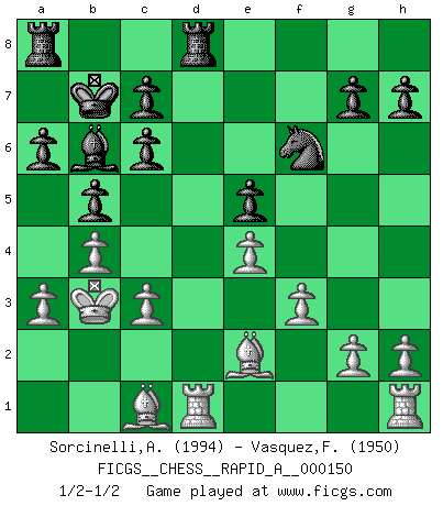 Last move : 1/2-1/2 2013 December 29 11:8:55 [Event "FICGS__CHESS__RAPID_A__000150"] [Site "FICGS"] [Date "2013.10.18"] [Round "1"] [White "Sorcinelli,Andrea"] [Black "Vasquez,Fernando"] [Result "1/2-1/2"] [WhiteElo "1994"] [BlackElo "1950"] 1.e4 e5 2.Nf3 Nf6 3.Nc3 Nc6 4.d4 exd4 5.Nxd4 Bb4 6.Nxc6 dxc6 7.Qxd8+ Kxd8 8.Bd2 Be6 9.f3 a6 10.a3 Bc5 11.Ne2 Kc8 12.b4 Ba7 13.Nf4 b5 14.Nxe6 fxe6 15.Be2 Kb7 16.O-O-O e5 17.Kb2 Bd4+ 18.c3 Bb6 19.Kb3 Rhd8 20.Bc1 1/2-1/2 Petrov Three knights game Queenside Castling by player White (move 16) This chess game ended in a draw. Follow this game move after move (download)There is no remorse like the remorse of Chess. (H. G. Wells) Das Schachspiel ist ein See, in welchem eine Mücke baden und ein Elefant ertrinken kann. (Emanuel Lasker) El ganar no lo es todo... pero el perder es nada. (Mednis) Il n'y a pas de prix trop élevé au scalp de l'ennemi. (Koblentz) He is a liar. I just don't know what the lie is yet. (Horatio Caine, C.S.I. Miami)