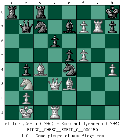 Last move : 1-0 2013 October 31 15:29:21 [Event "FICGS__CHESS__RAPID_A__000150"] [Site "FICGS"] [Date "2013.10.18"] [Round "1"] [White "Altieri,Carlo"] [Black "Sorcinelli,Andrea"] [Result "1-0"] [WhiteElo "1990"] [BlackElo "1994"] 1.e4 c5 2.Nf3 d6 3.d4 cxd4 4.Nxd4 Nf6 5.Nc3 a6 6.Be3 e5 7.Nb3 Be7 8.f3 Be6 9.Qd2 O-O 10.O-O-O Nbd7 11.g4 b5 12.g5 b4 13.Ne2 Ne8 14.f4 a5 15.f5 Bxb3 16.cxb3 a4 17.bxa4 Rxa4 18.Kb1 Rxa2 19.Nc1 Ra8 20.Nb3 Qb8 21.h4 Nc7 22.Bc4 Qb7 23.Qd3 Rfc8 24.g6 Nf6 25.gxf7+ Kh8 26.Rhg1 Nxe4 27.Rxg7 1-0 Sicilian : Najdorf, Byrne (English) attack Kingside Castling by player Black (move 9) Queenside Castling by player White (move 10) Player White won this chess game. Follow this game move after move (download)You can only get good at Chess if you love the game. (Bobby Fischer) Als ich elf wurde, wurde ich einfach gut. (Robert James Fischer) El Ajedrez lo es todo: arte, ciencia y deporte. (Anatoly Karpov) Les échecs sont un jeu terrible. Si vous n'avez pas le centre, votre adversaire a une position plus libre. Par contre, si vous avez le centre, alors vous avez vraiment quelque chose pour laquelle vous inquiéter ! (Siegbert Tarrasch) Warrior pose battles inner weakness and wins focus. You see that there is no war within you. You're on your own side, and you are your own strength. (Terri Guillemets)