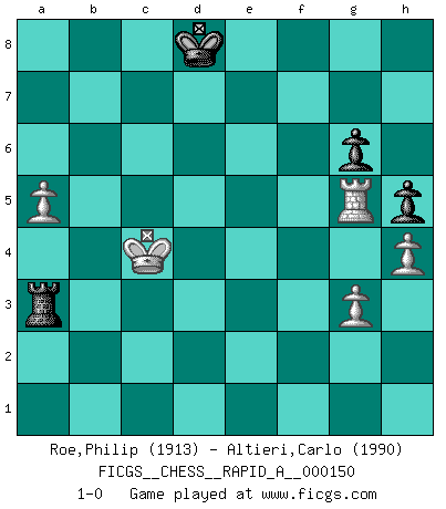 Last move : 1-0 2013 November 19 9:1:20 [Event "FICGS__CHESS__RAPID_A__000150"] [Site "FICGS"] [Date "2013.10.18"] [Round "1"] [White "Roe,Philip"] [Black "Altieri,Carlo"] [Result "1-0"] [WhiteElo "1913"] [BlackElo "1990"] 1.c4 e5 2.Nc3 Nf6 3.g3 Bb4 4.Nf3 e4 5.Nd4 O-O 6.Bg2 Re8 7.O-O Nc6 8.Nc2 Ba5 9.Ne3 d6 10.b3 Bb6 11.Bb2 Qe7 12.Ncd5 Nxd5 13.Nxd5 Qg5 14.d4 exd3 15.Qxd3 Bf5 16.e4 Be6 17.Kh1 Qh5 18.f4 Bg4 19.Rae1 Qh6 20.f5 Ne5 21.Bxe5 dxe5 22.c5 Bxc5 23.Nxc7 Red8 24.Qb5 b6 25.Nxa8 Rxa8 26.Qd7 a5 27.Rc1 Qg5 28.Rc2 Rd8 29.Qc7 h5 30.Qxe5 Bd1 31.Rxc5 bxc5 32.Qxc5 Qd2 33.e5 Be2 34.Ra1 Qb2 35.Re1 Qd2 36.Qf2 Bg4 37.Qxd2 Rxd2 38.e6 fxe6 39.fxe6 Bxe6 40.Rxe6 Rd1+ 41.Bf1 Rxf1+ 42.Kg2 Rb1 43.Re2 Kf7 44.Kf3 Kf6 45.Rc2 Rh1 46.Rc6+ Kf7 47.h4 Ra1 48.a4 Rb1 49.Rc3 Kf6 50.Kf4 Rb2 51.Rc6+ Kf7 52.Rb6 Rf2+ 53.Ke4 Re2+ 54.Kf3 Rc2 55.Rb5 Rc3+ 56.Kf4 g6 57.Rxa5 Rxb3 58.Rb5 Ra3 59.a5 Kg7 60.Rg5 Kf6 61.Ke4 Ke7 62.Kd4 Kd8 63.Kc4 1-0 English : Bremen, Smyslov system Kingside Castling by player Black (move 5) Kingside Castling by player White (move 7) 10 pieces endgame at move 57 : White KRPPPP , Black KRPP WHITE : King + 1 Rook 4 Pawns BLACK : King + 1 Rook 2 Pawns 9 pieces endgame at move 57 : White KRPPP , Black KRPP WHITE : King + 1 Rook 3 Pawns BLACK : King + 1 Rook 2 Pawns Player White won this chess game. Follow this game move after move (download)Some sacrifices are sound; the rest are mine. (Mikhail Tal) Man gibt nur Pakete auf. (Paul Keres) Alekhine es un poeta que crea un trabajo de arte de algo que raramente inspiraría a otra persona a mandar una tarjeta postal. (Max Euwe) Nous vivons dans un monde échiquéen : chaque jour qui passe est un défi à relever. (Philosophe Sasha) The message for business people contemplating their place in the cyberspace is simple and direct: get linked or get lost. (Vic Sussman and Kenan Pollack)
