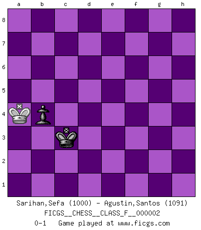 Last move : 0-1 2006 August 3 12:53:53 [Event "FICGS__CHESS__CLASS_F__000002"] [Site "FICGS"] [Date "2006.05.23"] [Round "1"] [White "Sarihan,Sefa"] [Black "Agustin,Santos"] [Result "0-1"] [WhiteElo "1000"] [BlackElo "1091"] 1.e4 c5 2.Nf3 Nc6 3.c3 e6 4.Na3 Be7 5.Bd3 Nf6 6.e5 Ng4 7.Qe2 O-O 8.h3 Nh6 9.Nc4 b5 10.Ne3 Bb7 11.O-O a6 12.Bc2 d6 13.d4 cxd4 14.cxd4 Nb4 15.Bd1 dxe5 16.dxe5 Rc8 17.a3 Nd3 18.Bb3 Nxc1 19.Raxc1 Rxc1 20.Rxc1 Qb6 21.Rc3 Rd8 22.Bc2 Nf5 23.Bxf5 exf5 24.Nxf5 Bc5 25.Qc2 Bxf3 26.Rxf3 Rd5 27.Qe4 Qe6 28.Qg4 Qxe5 29.Ne3 Rd8 30.b4 Bxe3 31.Rxe3 Qa1+ 32.Kh2 Qf6 33.Qe4 g6 34.f4 Kg7 35.Qe5 Rd6 36.g4 Qxe5 37.fxe5 Re6 38.Kg3 g5 39.Kf3 f6 40.exf6+ Kxf6 41.Rc3 Kg6 42.Rc5 h5 43.gxh5+ Kxh5 44.Rc8 Rh6 45.Kg3 Rd6 46.Rh8+ Rh6 47.Rxh6+ Kxh6 48.Kg4 Kg6 49.h4 gxh4 50.Kxh4 Kf5 51.Kg3 Ke4 52.Kg4 Kd4 53.Kf4 Kc4 54.Ke4 Kb3 55.Kd4 Kxa3 56.Kc5 Ka4 57.Kb6 Kxb4 58.Kxa6 Kc4 59.Ka5 b4 60.Ka4 Kc3 0-1 Sicilian defense Kingside Castling by player Black (move 7) Kingside Castling by player White (move 11) 10 pieces endgame at move 43 : White KRPPP , Black KRPPP WHITE : King + 1 Rook 3 Pawns BLACK : King + 1 Rook 3 Pawns 9 pieces endgame at move 47 : White KRPPP , Black KPPP WHITE : King + 1 Rook 3 Pawns BLACK : King + 3 Pawns 8 pieces endgame at move 47 : White KPPP , Black KPPP WHITE : King + 3 Pawns BLACK : King + 3 Pawns 7 pieces endgame at move 49 : White KPP , Black KPPP WHITE : King + 2 Pawns BLACK : King + 3 Pawns 6 pieces endgame at move 50 : White KPP , Black KPP WHITE : King + 2 Pawns BLACK : King + 2 Pawns 5 pieces endgame at move 55 : White KP , Black KPP WHITE : King + 1 Pawn BLACK : King + 2 Pawns 4 pieces endgame at move 57 : White K , Black KPP WHITE : King + BLACK : King + 2 Pawns 3 pieces endgame at move 58 : White K , Black KP WHITE : King + BLACK : King + 1 Pawn Player Black won this chess game. Follow this game move after move (download)I thought the most common mistake [in chess] was the first one: Learning the game :P (Garvin Gray, FICGS forum) Als er Schachweltmeister wurde ließ er praktisch alle stärksten Sovietspieler für sich arbeiten. Wenn ein auch nur mittelmässiger Meister ein Spezialist für eine bestimmte Eröffnung war, wurde er von Karpov gerufen. Das wurde alles geheim gehalten. (Mikhail Moiseyevich Botvinik) El hombre es un frívolo, una creatura engañosa y como un jugador de Ajedrez, se preocupa mas por el proceso de obtener su meta que de la meta por sí misma. (Dostoyevsky) J'ai vu le vaincu d'Echecs jouer des années durant dans l'espoir de la fête de la victoire. Car tu es plus riche de ce qu'elle existe si même elle n'est point pour toi. Ainsi de la perle du fond des mers. (Antoine de Saint-Exupéry) In God we trust, all others we virus scan. (Anonymous)