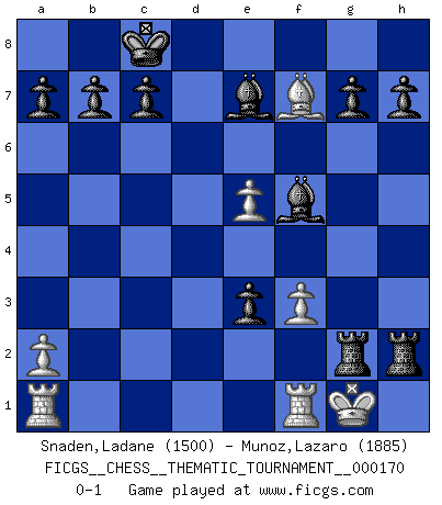 Last move : 0-1 2013 October 28 2:8:58 [Event "FICGS__CHESS__THEMATIC_TOURNAMENT__000170"] [Site "FICGS"] [Date "2013.10.19"] [Round "1"] [White "Snaden,Ladane"] [Black "Munoz,Lazaro"] [Result "0-1"] [WhiteElo "1500"] [BlackElo "1885"] 1.e4 e5 2.Nf3 Nc6 3.Bc4 Bc5 4.b4 Bxb4 5.c3 Be7 6.d4 Na5 7.Be2 exd4 8.cxd4 Nf6 9.Nc3 d5 10.Qa4+ Nc6 11.e5 Ne4 12.Nxe4 dxe4 13.Nd2 Qxd4 14.Qxd4 Nxd4 15.Bd1 Bf5 16.O-O O-O-O 17.Bb2 Ne2+ 18.Bxe2 Rxd2 19.Bc4 Rxb2 20.Rfc1 Rd8 21.Bxf7 R8d2 22.Rf1 e3 23.f3 Rxg2+ 24.Kh1 Rxh2+ 25.Kg1 Rbg2+ 0-1 Evans gambit : Cordel variation Kingside Castling by player White (move 16) Queenside Castling by player Black (move 16) Player Black won this chess game. Follow this game move after move (download)A bad plan is better than none at all. (Frank Marshall) Sie führen leise Selbstgespräche, schlürfen lautstark ihre Getränke, schmatzen hörbar beim Essen, blasen ihrem Gegenüber Rauch in die Augen, niesen ihm ins Gesicht, starren ihn unverwandt an, bis er sich unter ihren Blicken windet, rutschen ständig auf ihrem Stuhl hin und her, rülpsen und bohren in der Nase. (Anonymous) Tu no necesitas jugar muy bien, únicamente ayudar a tu oponenet a que juegue muy mal. (Genrikh Chepukaitis) Les Echecs sont et restent toujours un combat, un combat intégral comme la boxe, la lutte ou un autre sport, et où il doit y avoir un vainqueur et un vaincu. (Joseph Emil Diemer) A good teacher is like a candle - it consumes itself to light the way for others. (Author unknown)